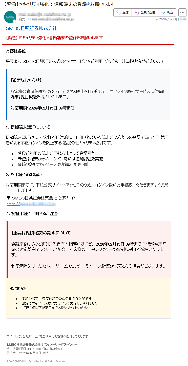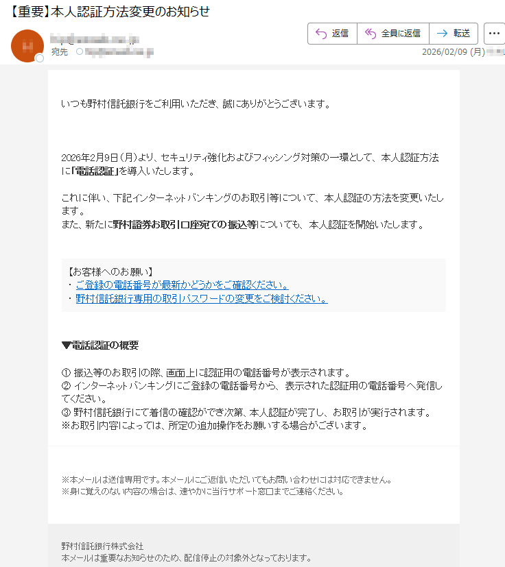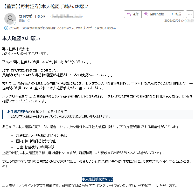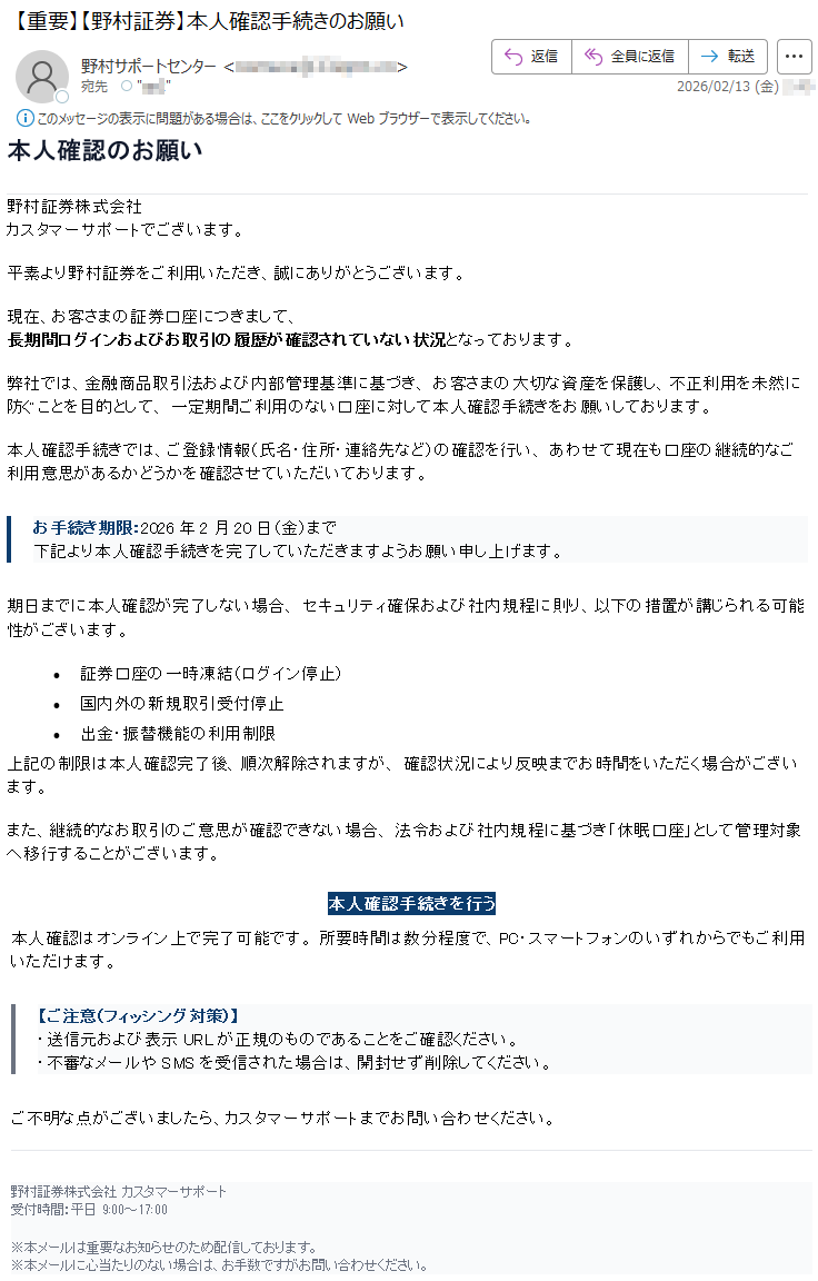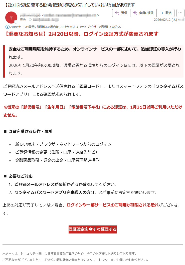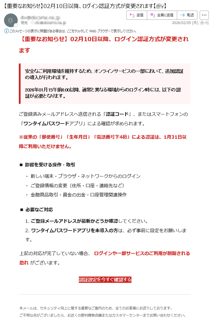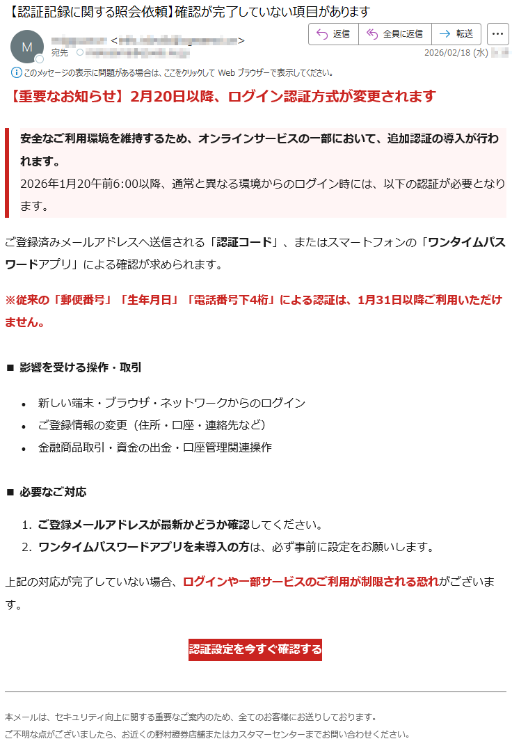 野村證券になりすました偽メール「件名:【重要なお知らせ】2月10日以降、ログイン認証方式が変更されます【***】」(本偽メールは、実在の企業と無関係に送信されたものです)