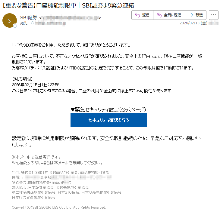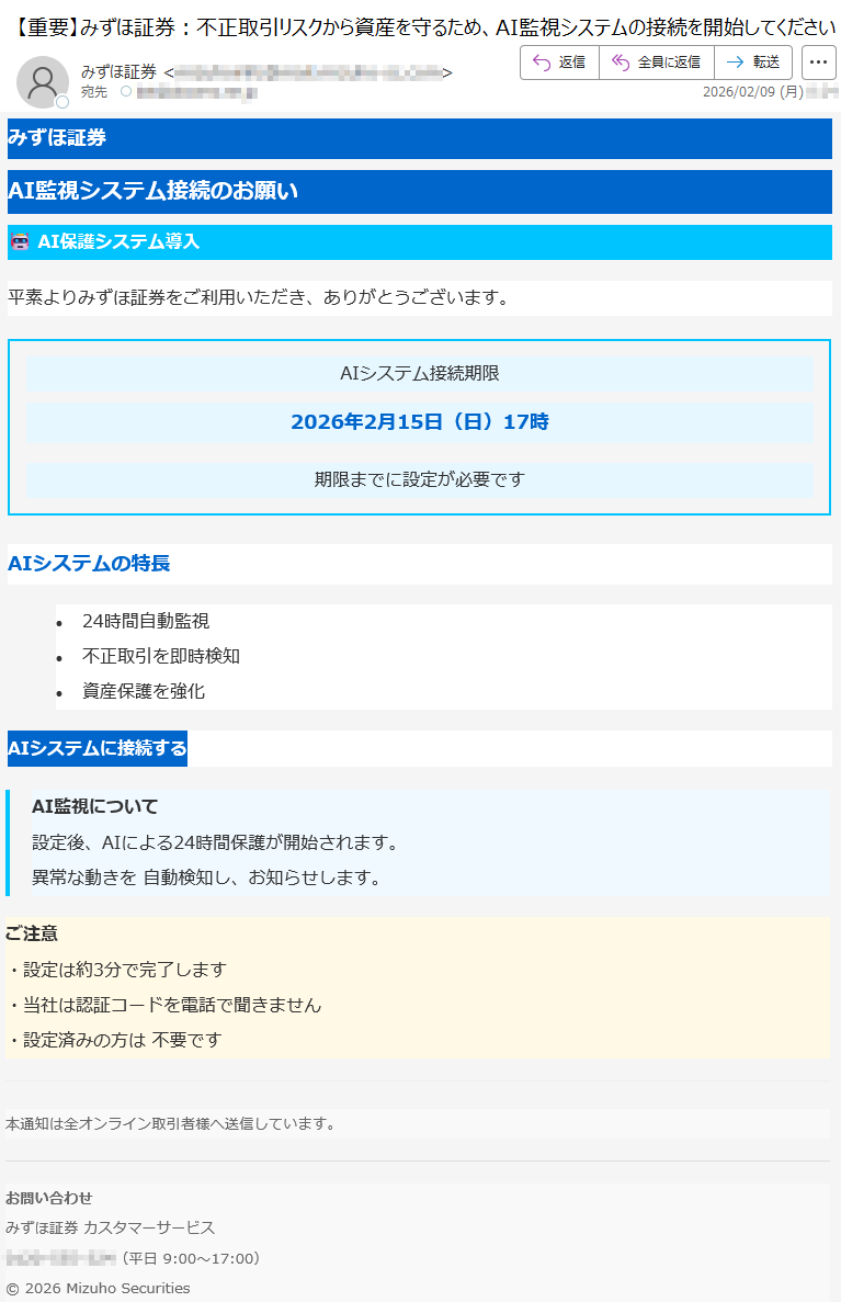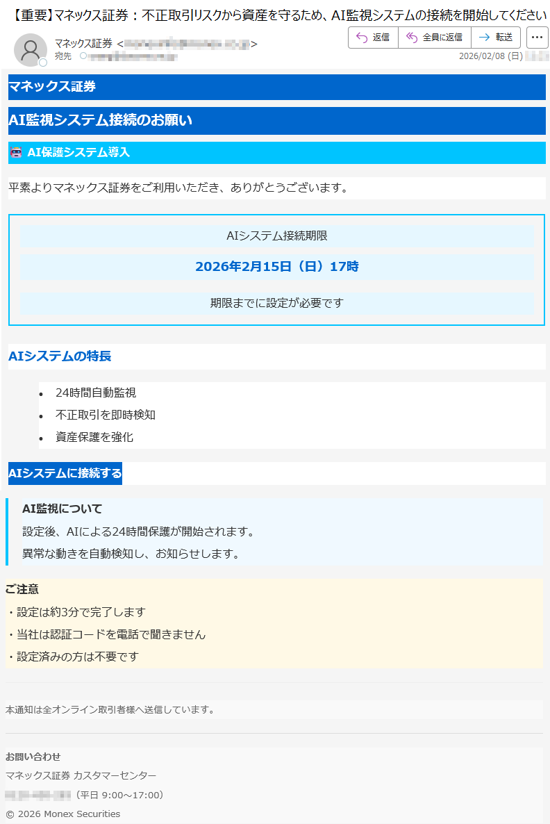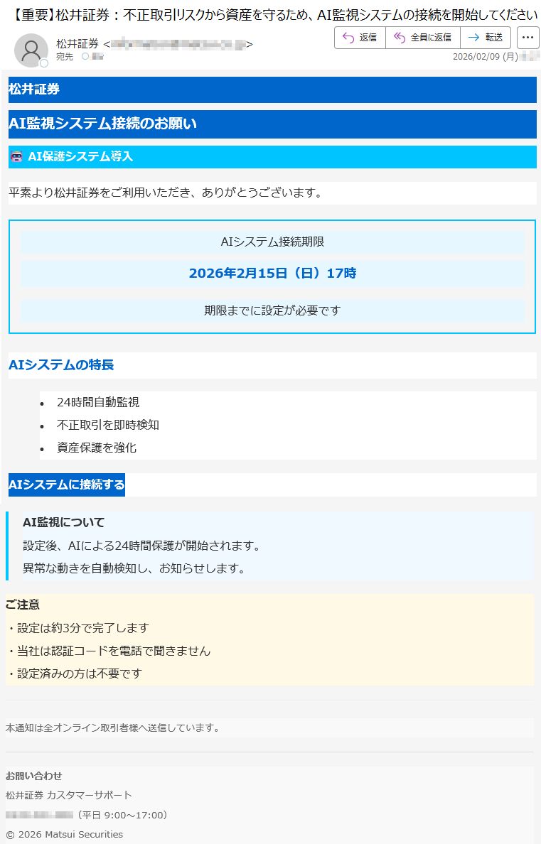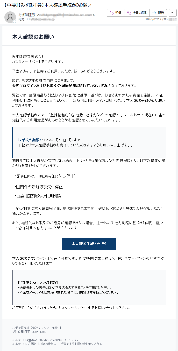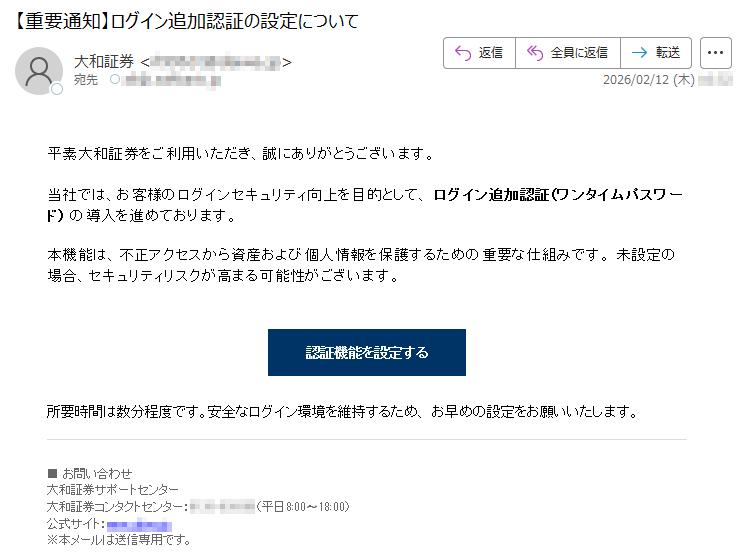 野村證券になりすました偽メール「件名:【重要なお知らせ】2月10日以降、ログイン認証方式が変更されます【***】」(本偽メールは、実在の企業と無関係に送信されたものです)