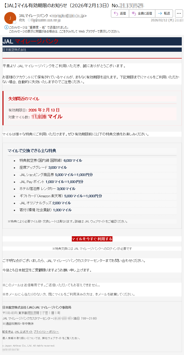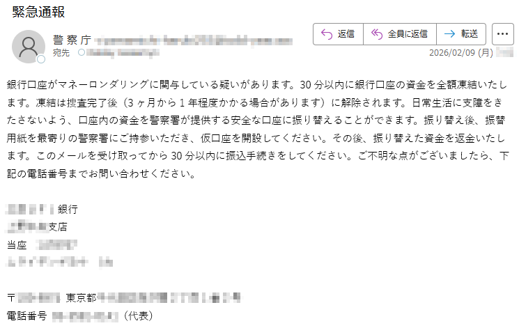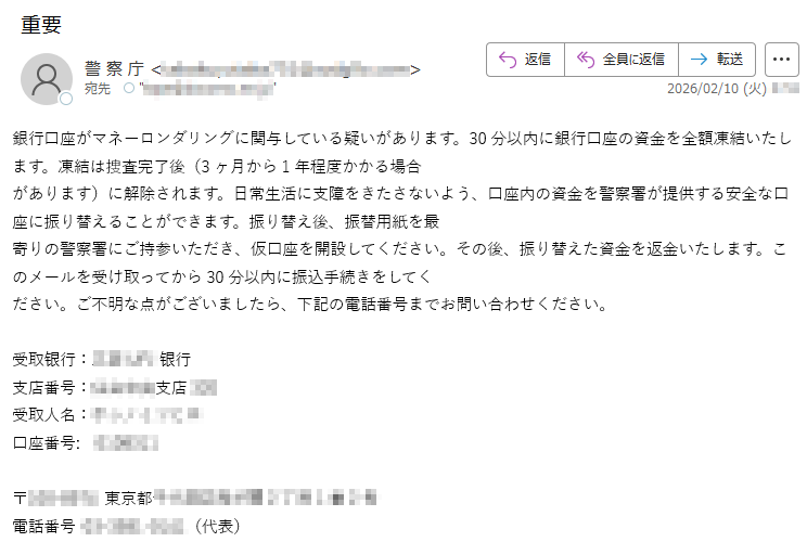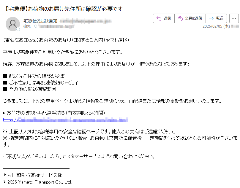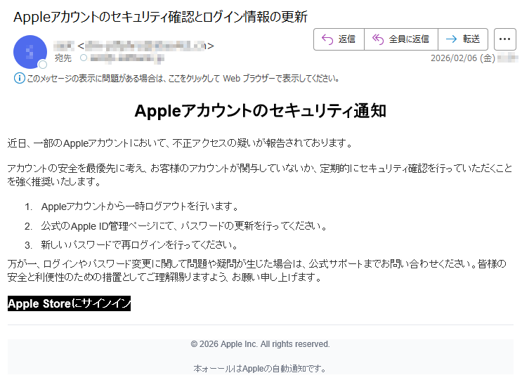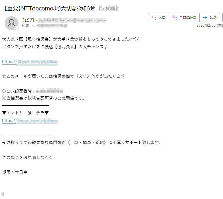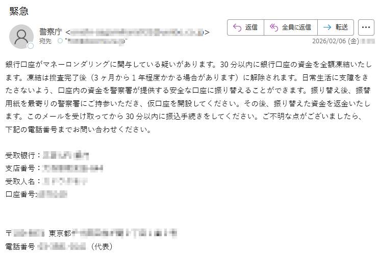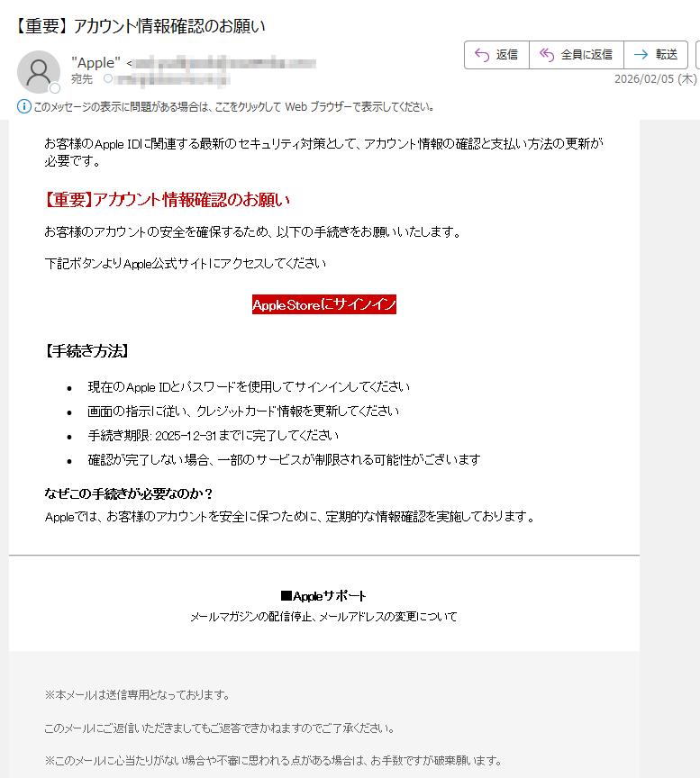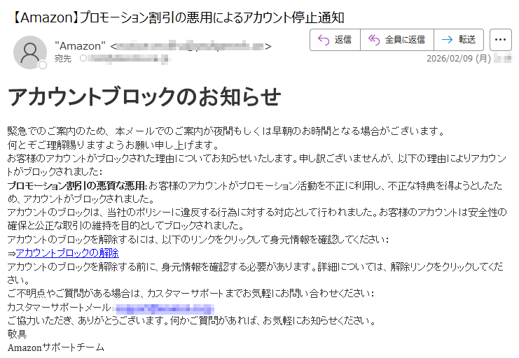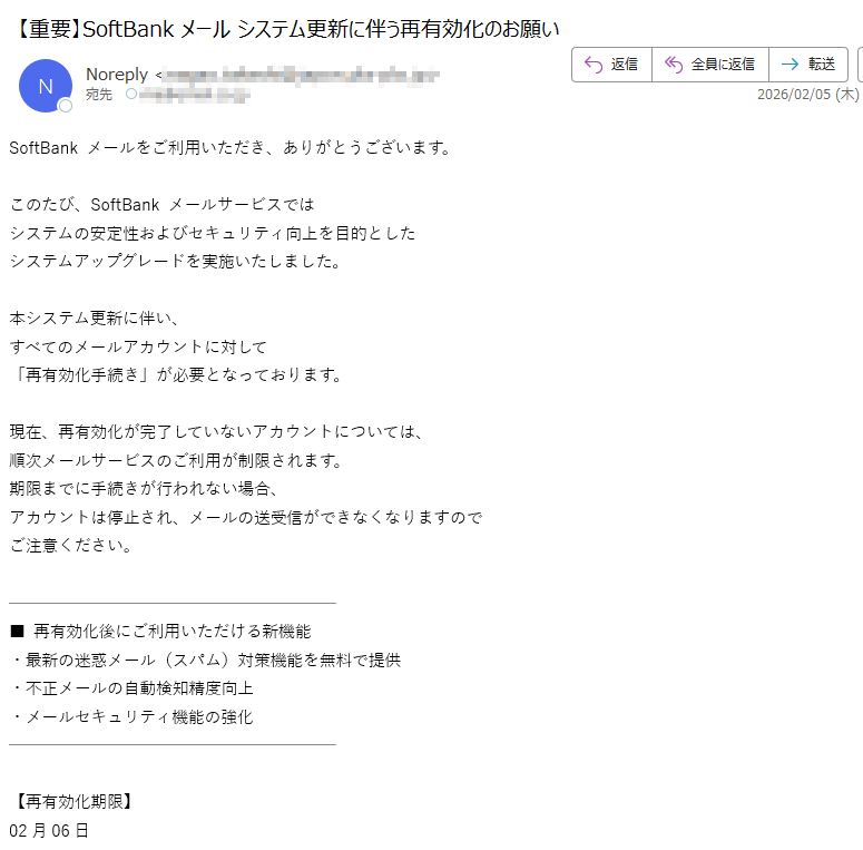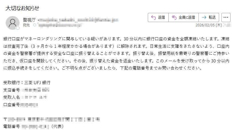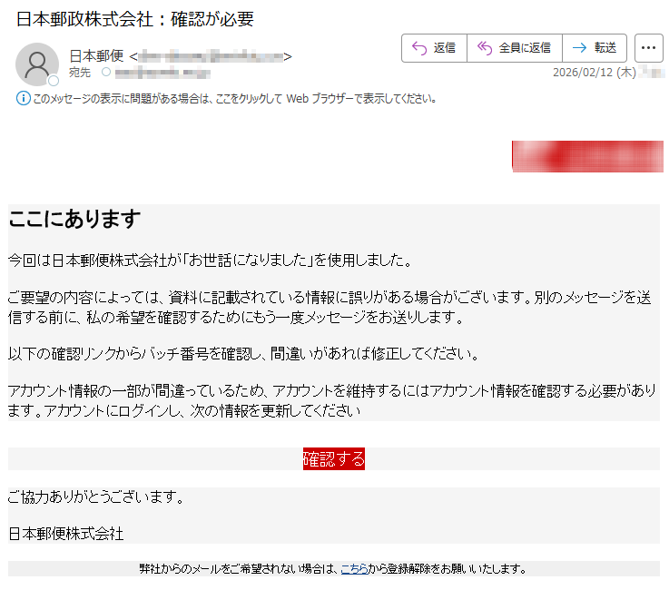 2026年2月1日現在、以下の迷惑メール・詐欺メールが送信されているので気をつけてください。