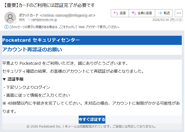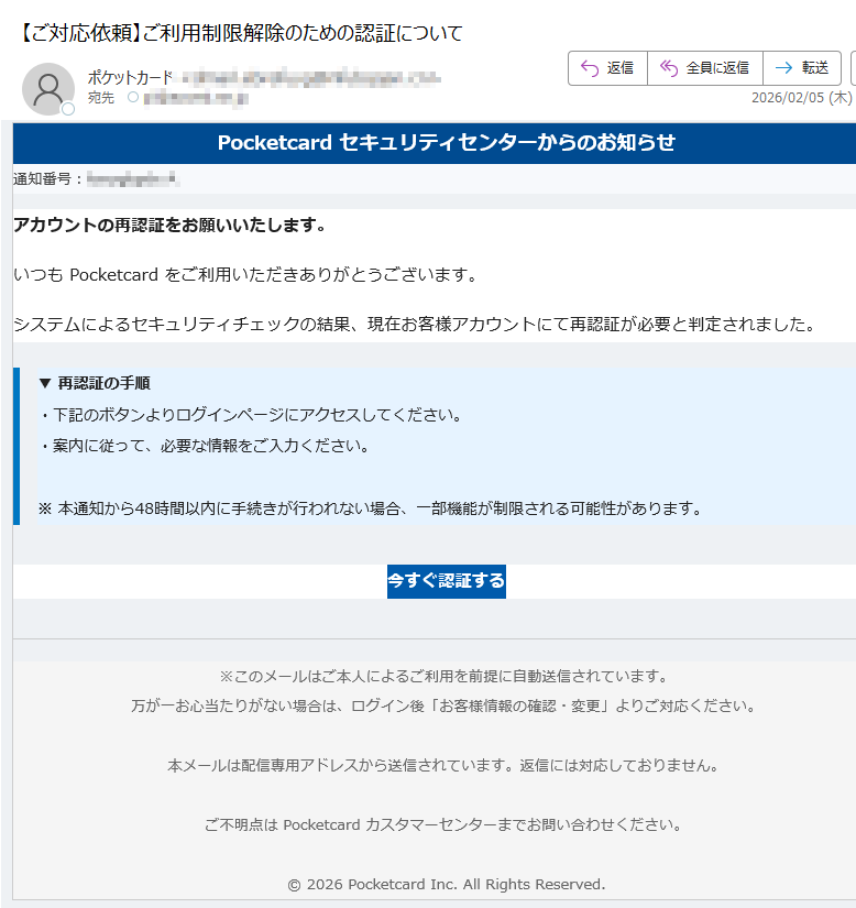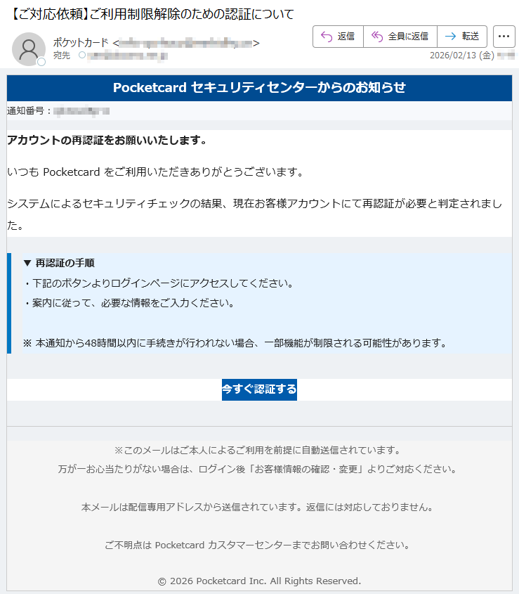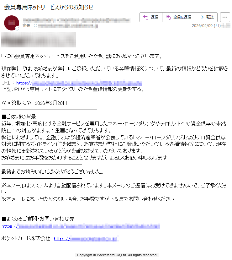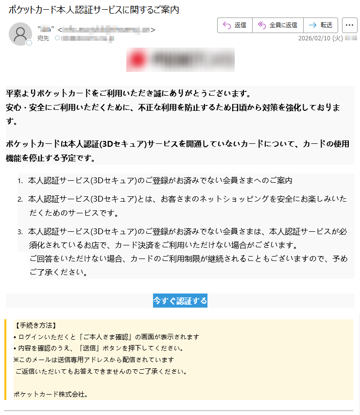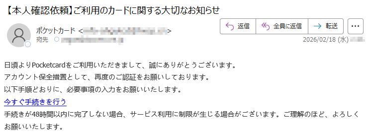 ポケットカードになりすました偽メール「件名:【本人確認依頼】ご利用のカードに関する大切なお知らせ」(本偽メールは、実在の企業と無関係に送信されたものです)