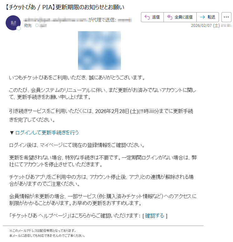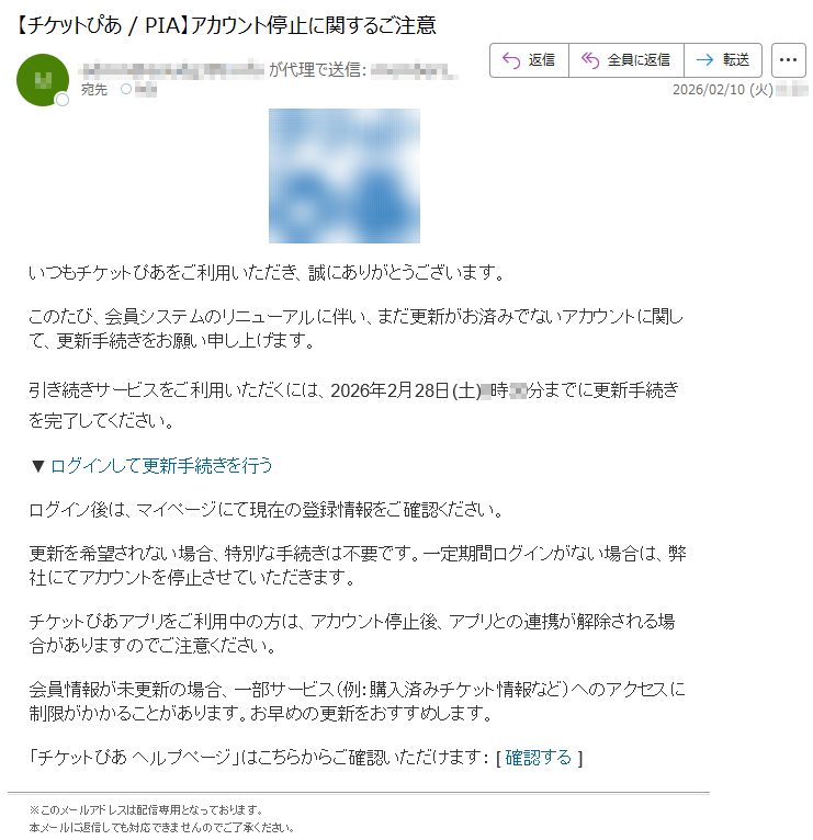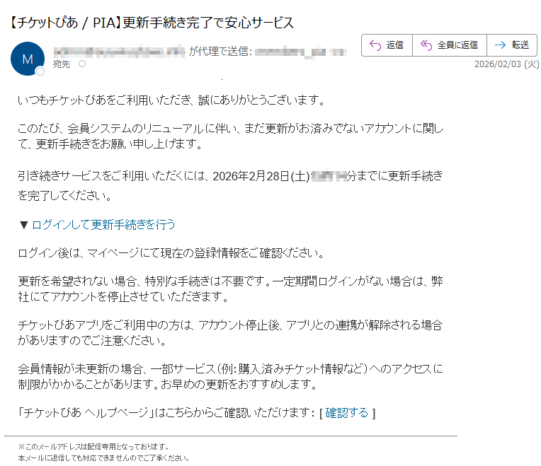 ![いつもチケットぴあをご利用いただき、誠にありがとうございます。このたび、会員システムのリニューアルに伴い、まだ更新がお済みでないアカウントに関して、更新手続きをお願い申し上げます。引き続きサービスをご利用いただくには、2026年2月28日(土)*時**分までに更新手続きを完了してください。▼ログインして更新手続きを行うログイン後は、マイページにて現在の登録情報をご確認ください。更新を希望されない場合、特別な手続きは不要です。一定期間ログインがない場合は、弊社にてアカウントを停止させていただきます。チケットぴあアプリをご利用中の方は、アカウント停止後、アプリとの連携が解除される場合がありますのでご注意ください。会員情報が未更新の場合、一部サービス(例:購入済みチケット情報など)へのアクセスに制限がかかることがあります。お早めの更新をおすすめします。「チケットぴあヘルプページ」はこちらからご確認いただけます:[確認する]※このメールアドレスは配信専用となっております。本メールに返信しても対応できませんのでご了承ください。](../../images/alert/2026/2m/nise_mail0202_06.png)