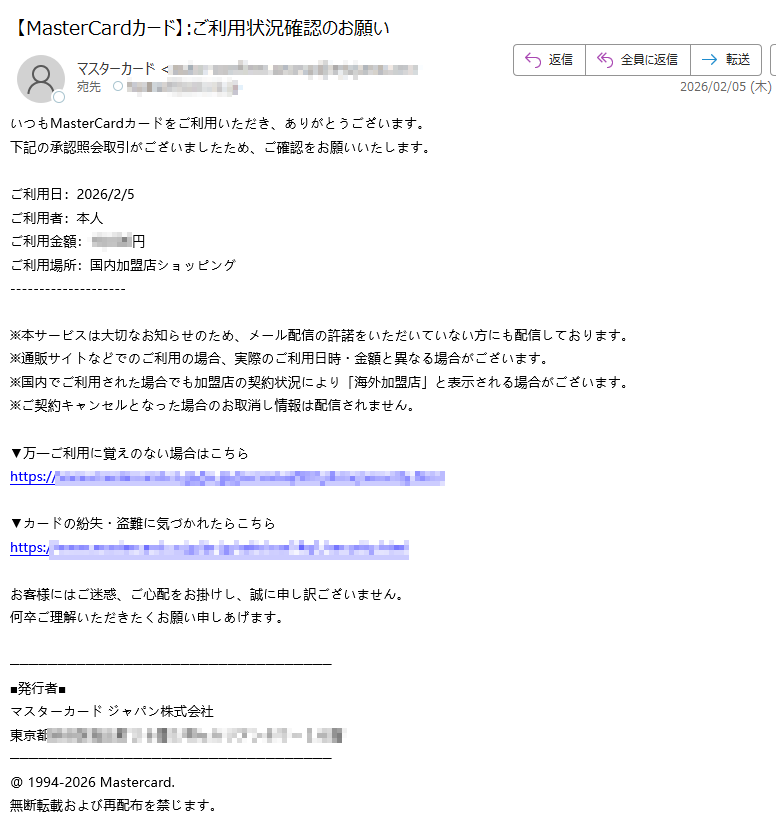 ![いつもMastercardをご利用いただき、誠にありがとうございます。日頃よりMastercardをご愛用いただき、厚く御礼申し上げます。このたび、お客様のアカウントの安全性を一層強化するため、セキュリティシステムの重要な更新を実施することとなりました。■認証手続きの方法下記のURLより、セキュリティ認証ページへアクセスしていただき、画面の指示に従って手続きを進めてください。[セキュリティ認証ページ]https://*****※本認証手続きは、お客様の大切な資産を保護するためのものです。※認証情報は最新の暗号化技術により、厳重に保護されます。■お問い合わせ窓口MastercardアシスタンスセンターTEL:*****(24時間・年中無休)今後とも、お客様に安心・安全なサービスをご提供できるよう、努めてまいります。引き続き、Mastercardをご愛顧賜りますよう、よろしくお願い申し上げます。敬具Mastercardセキュリティ管理部本メールは送信専用のアドレスから配信されています。このメールに返信いただいてもご回答できませんので、あらかじめご了承ください。*****](../../images/alert/2026/2m/nise_mail0203_07.png)