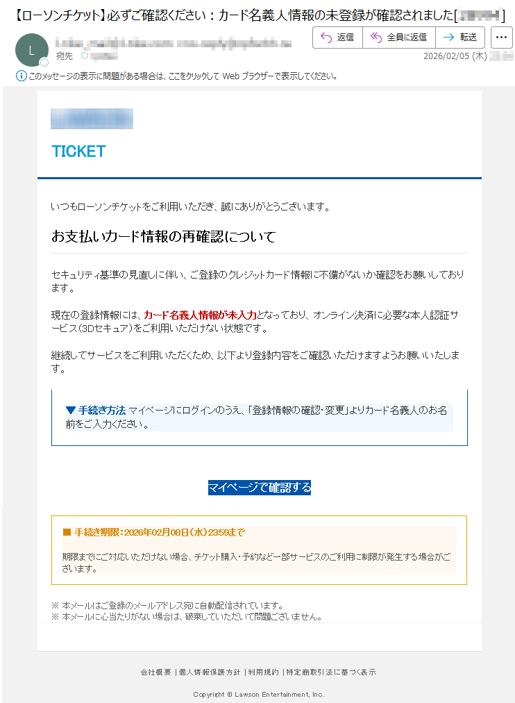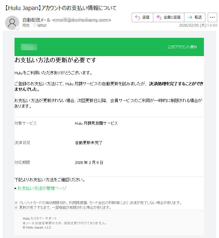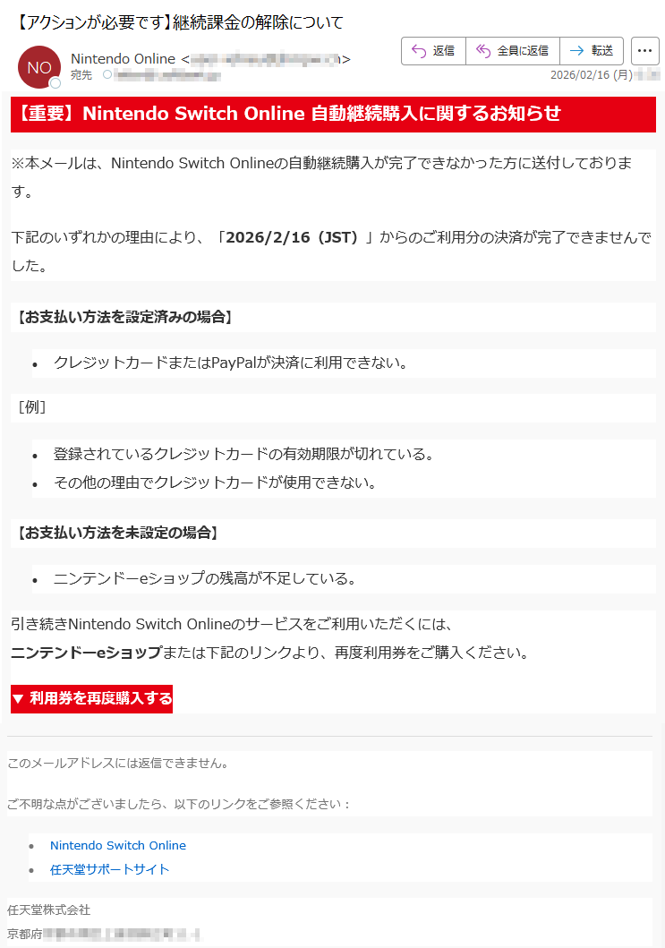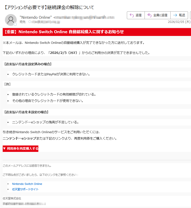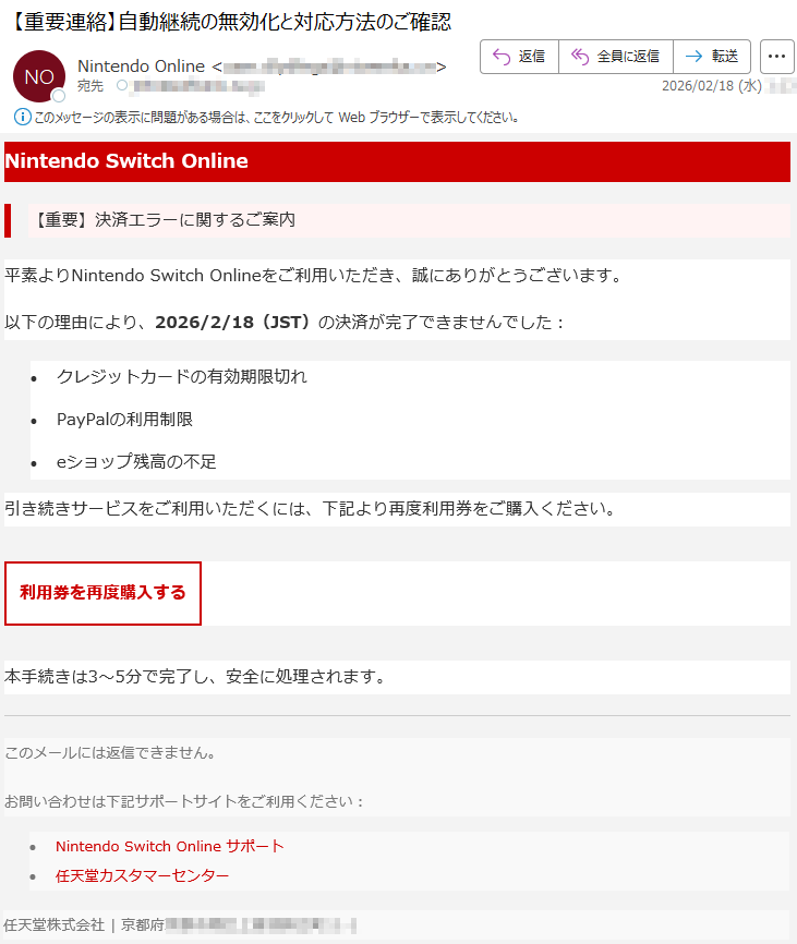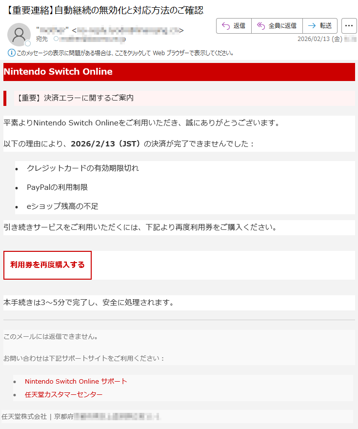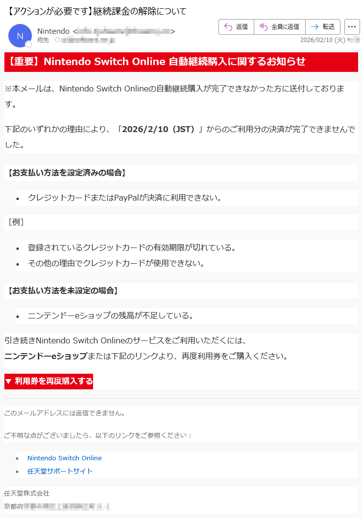 ![【重要】NintendoSwitchOnline自動継続購入に関するお知らせ※本メールは、NintendoSwitchOnlineの自動継続購入が完了できなかった方に送付しております。下記のいずれかの理由により、「2026/2/16(JST)」からのご利用分の決済が完了できませんでした。【お支払い方法を設定済みの場合】•クレジットカードまたはPayPalが決済に利用できない。[例]•登録されているクレジットカードの有効期限が切れている。•その他の理由でクレジットカードが使用できない。【お支払い方法を未設定の場合】•ニンテンドーeショップの残高が不足している。引き続きNintendoSwitchOnlineのサービスをご利用いただくには、ニンテンドーeショップまたは下記のリンクより、再度利用券をご購入ください。▼利用券を再度購入するこのメールアドレスには返信できません。ご不明な点がございましたら、以下のリンクをご参照ください:•NintendoSwitchOnline•任天堂サポートサイト任天堂株式会社京都府*****](../../images/alert/2026/2m/nise_mail0216_19.png)