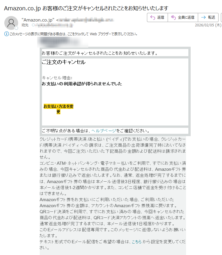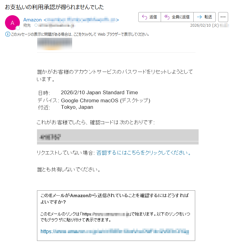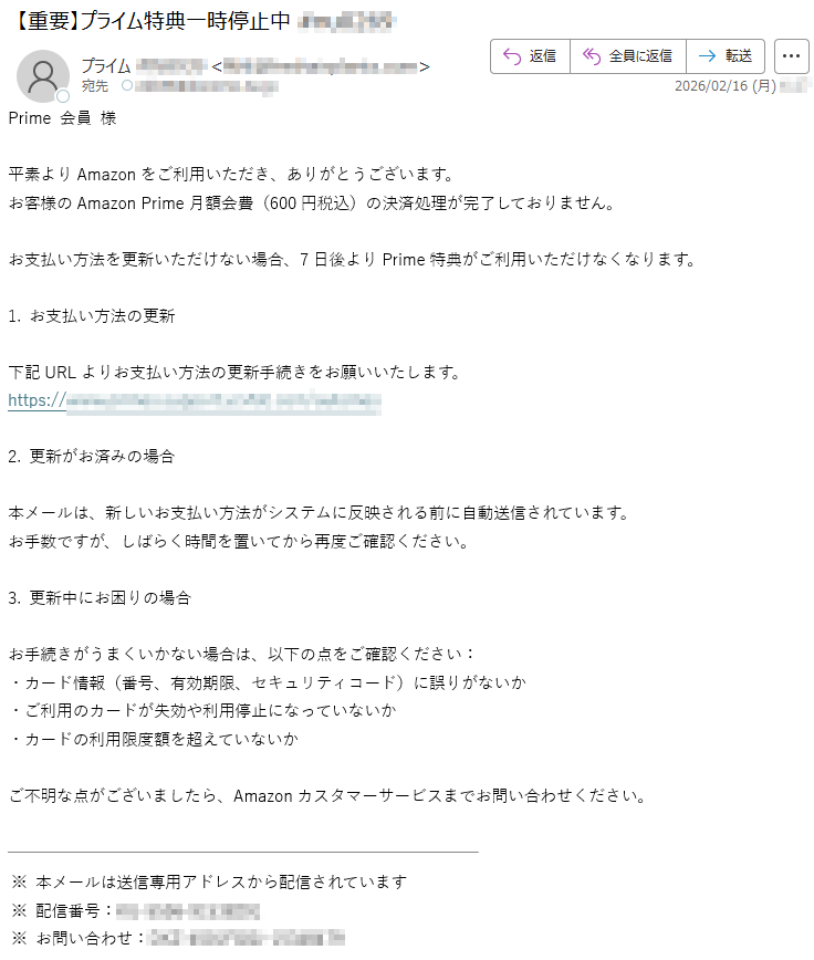 アマゾンになりすました偽メール「件名:【重要】プライム特典一時停止中*****」(本偽メールは、実在の企業と無関係に送信されたものです)