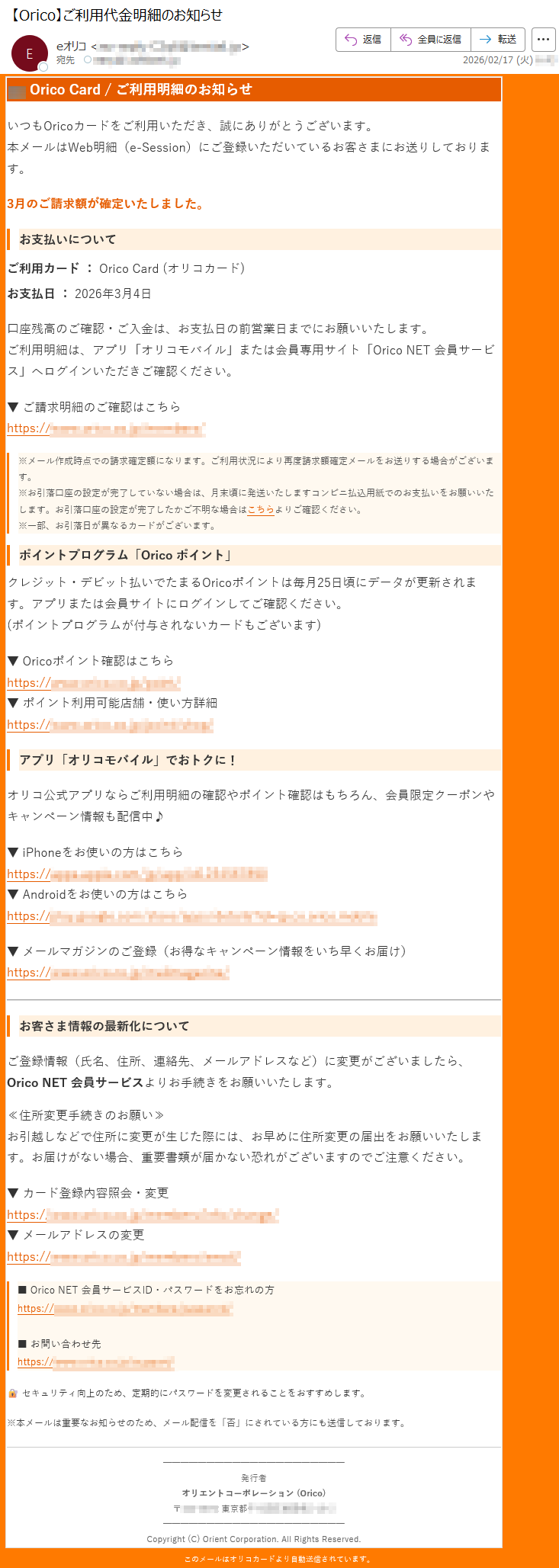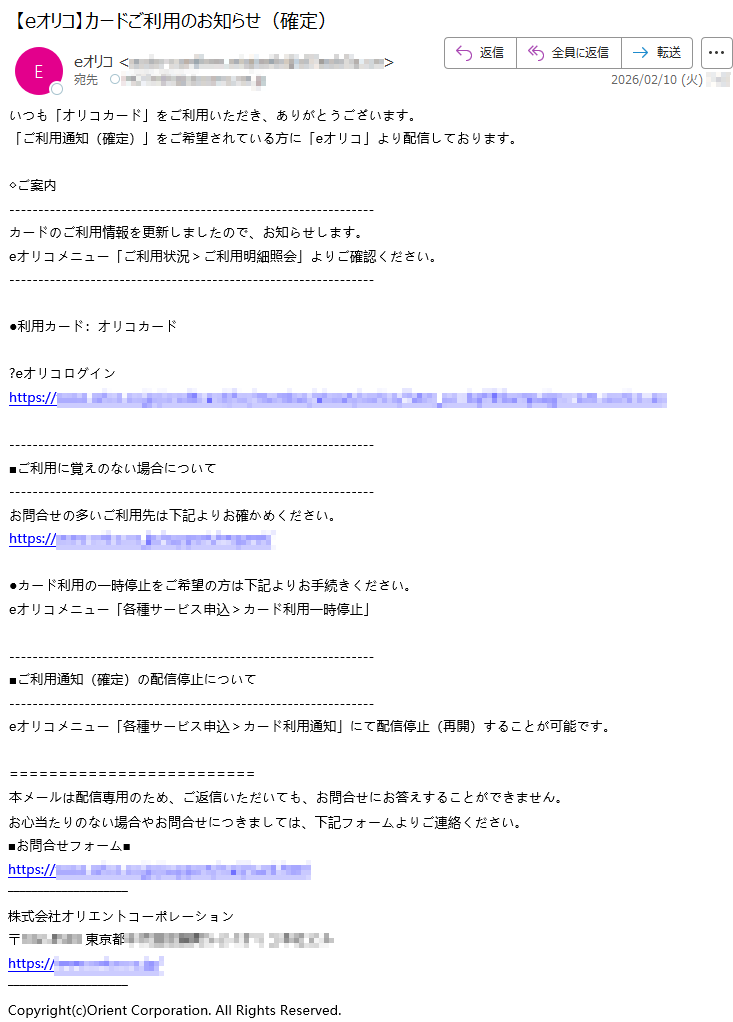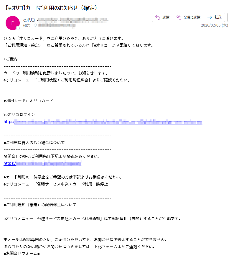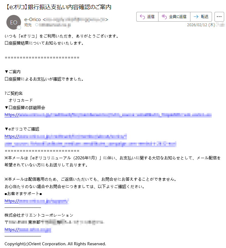 オリコカードになりすました偽メール「件名:【Orico】ご利用代金明細のお知らせ」(本偽メールは、実在の企業と無関係に送信されたものです)