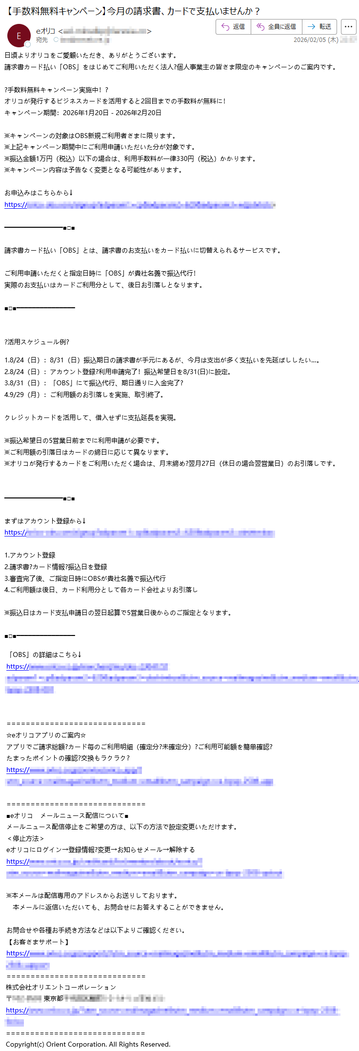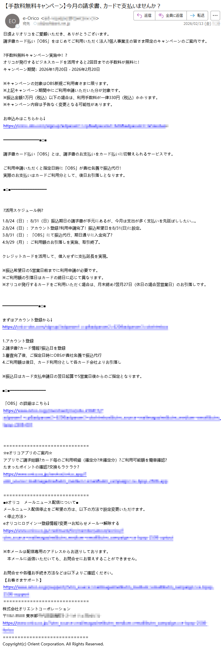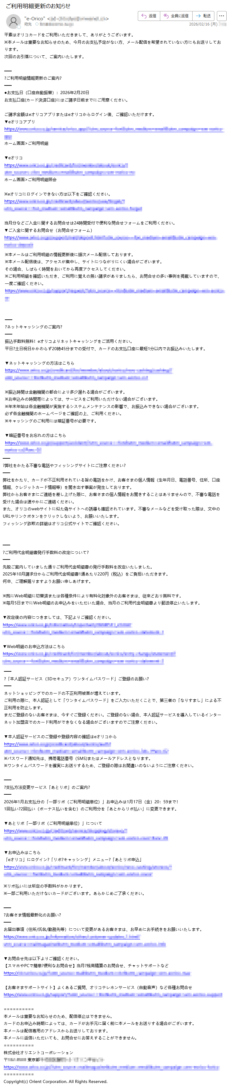 オリコカードになりすました偽メール「件名:【Orico】ご利用代金明細のお知らせ」(本偽メールは、実在の企業と無関係に送信されたものです)