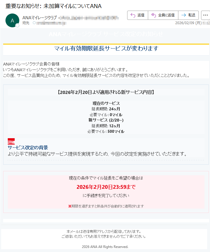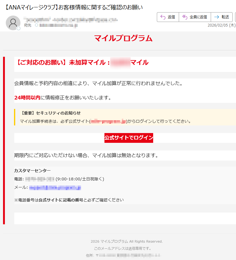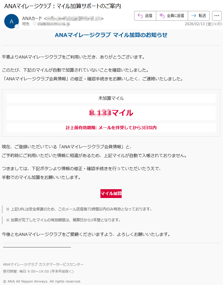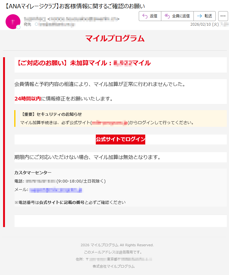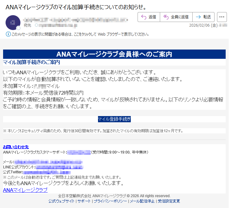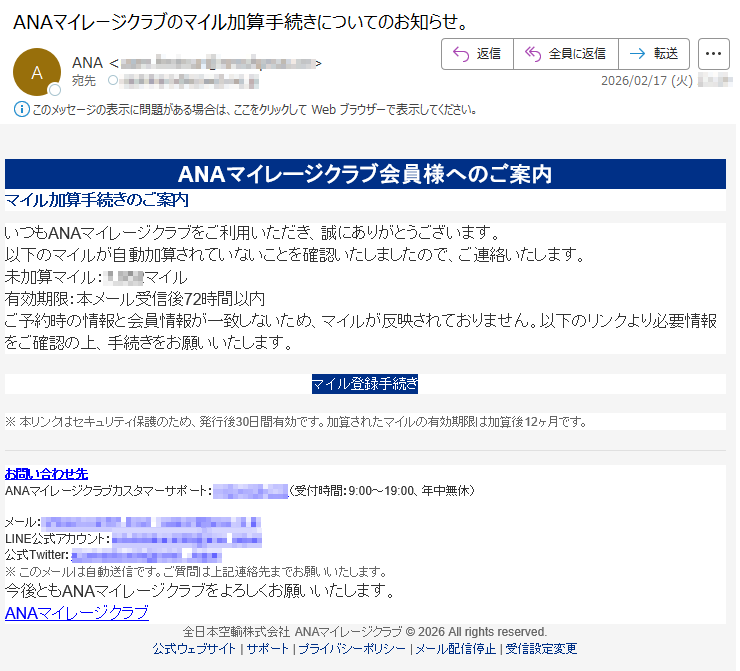 ANAマイレージクラブになりすました偽メール「件名:ANAマイレージクラブのマイル加算手続きについてのお知らせ。」(本偽メールは、実在の企業と無関係に送信されたものです)