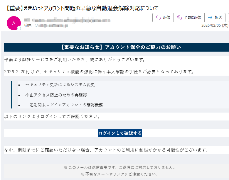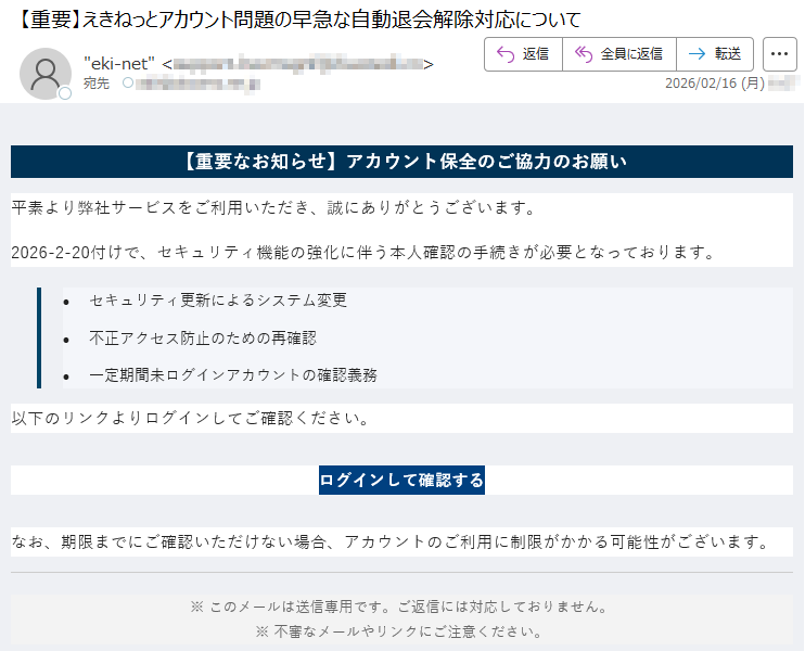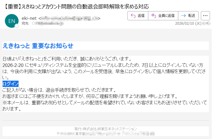 えきねっとになりすました偽メール「件名:【重要】えきねっとアカウント問題の早急な自動退会解除対応について」(本偽メールは、実在の企業と無関係に送信されたものです)