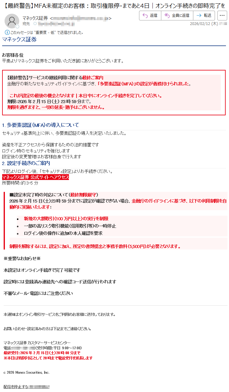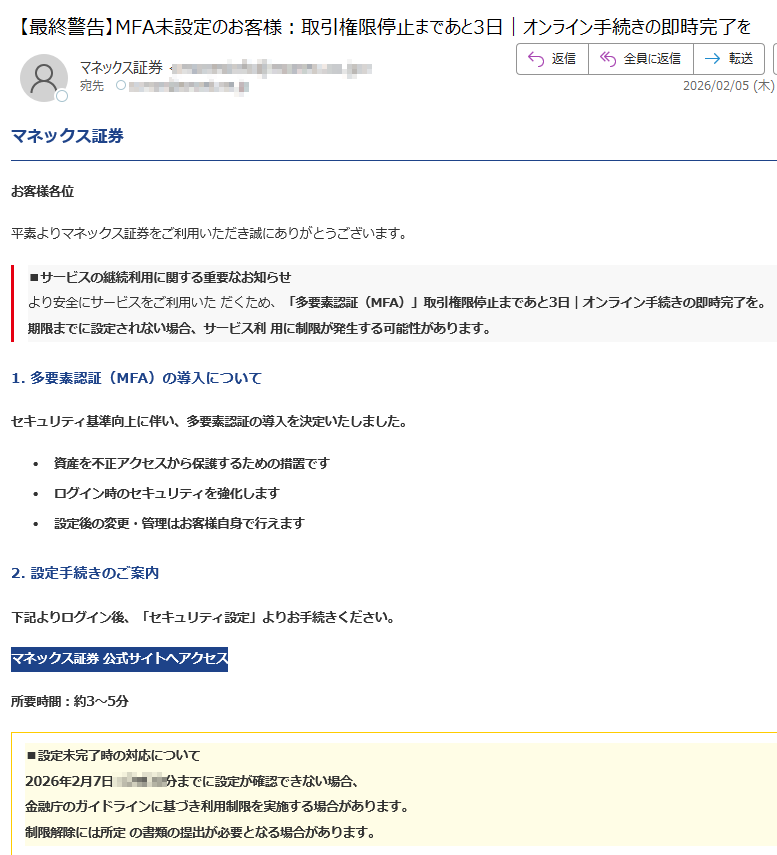 マネックス証券になりすました偽メール「件名:【最終警告】MFA未設定のお客様:取引権限停止まであと7日|オンライン手続きの即時完了を」(本偽メールは、実在の企業と無関係に送信されたものです)