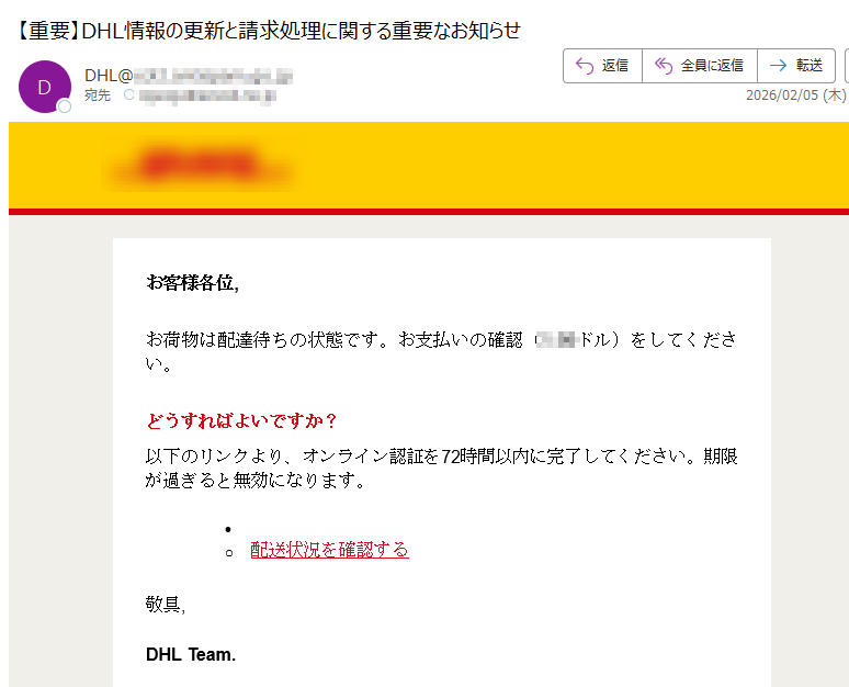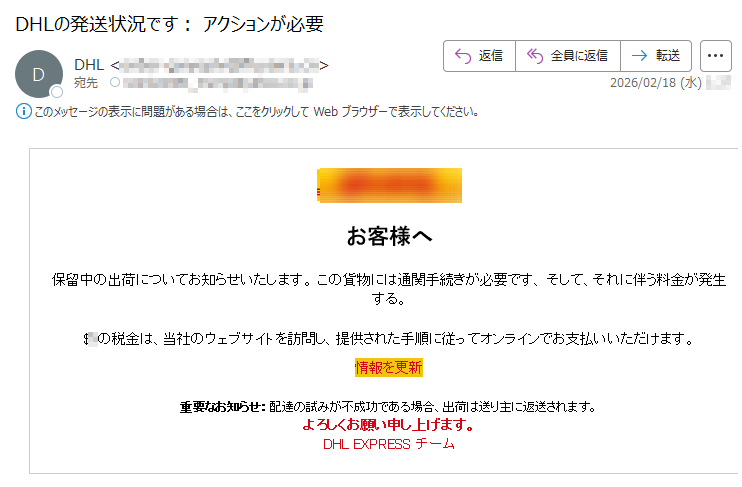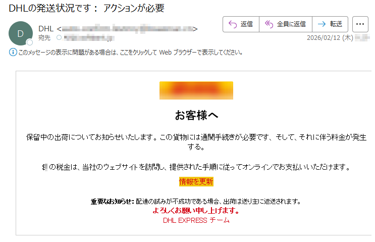DHLになりすました偽メール「件名:DHLの発送状況です: アクションが必要」(本偽メールは、実在の企業と無関係に送信されたものです)