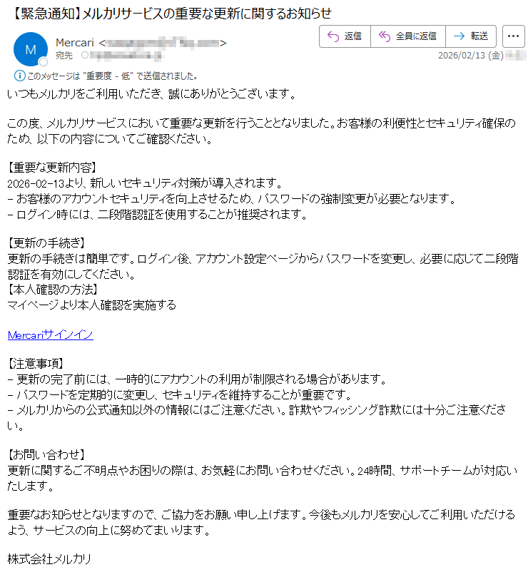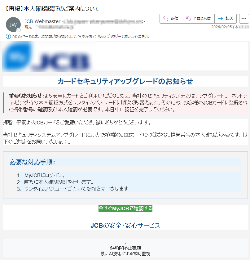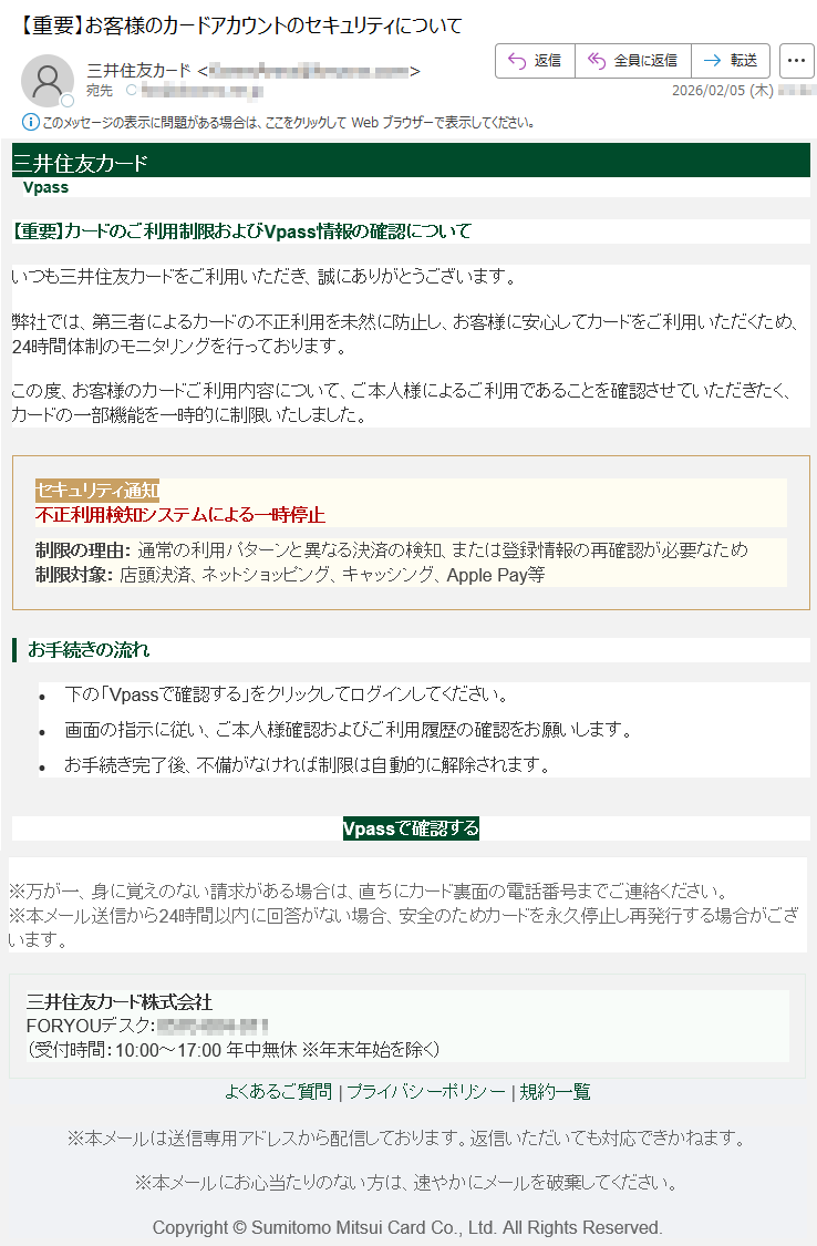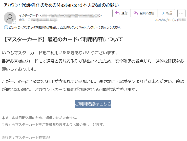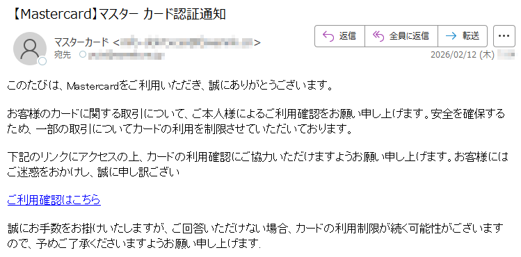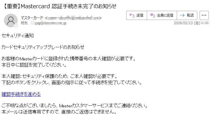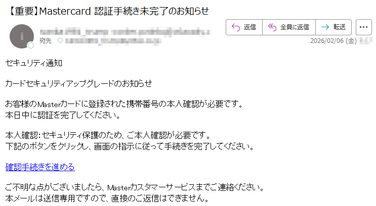 ![いつもMastercardをご利用いただき、誠にありがとうございます。日頃よりMastercardをご愛用いただき、厚く御礼申し上げます。このたび、お客様のアカウントの安全性を一層強化するため、セキュリティシステムの重要な更新を実施することとなりました。■認証手続きの方法下記のURLより、セキュリティ認証ページへアクセスしていただき、画面の指示に従って手続きを進めてください。[セキュリティ認証ページ]https://*****※本認証手続きは、お客様の大切な資産を保護するためのものです。※認証情報は最新の暗号化技術により、厳重に保護されます。■お問い合わせ窓口MastercardアシスタンスセンターTEL:*****(24時間・年中無休)今後とも、お客様に安心・安全なサービスをご提供できるよう、努めてまいります。引き続き、Mastercardをご愛顧賜りますよう、よろしくお願い申し上げます。敬具Mastercardセキュリティ管理部本メールは送信専用のアドレスから配信されています。このメールに返信いただいてもご回答できませんので、あらかじめご了承ください。*****](../../images/alert/2026/2m/nise_mail0209_14.png)