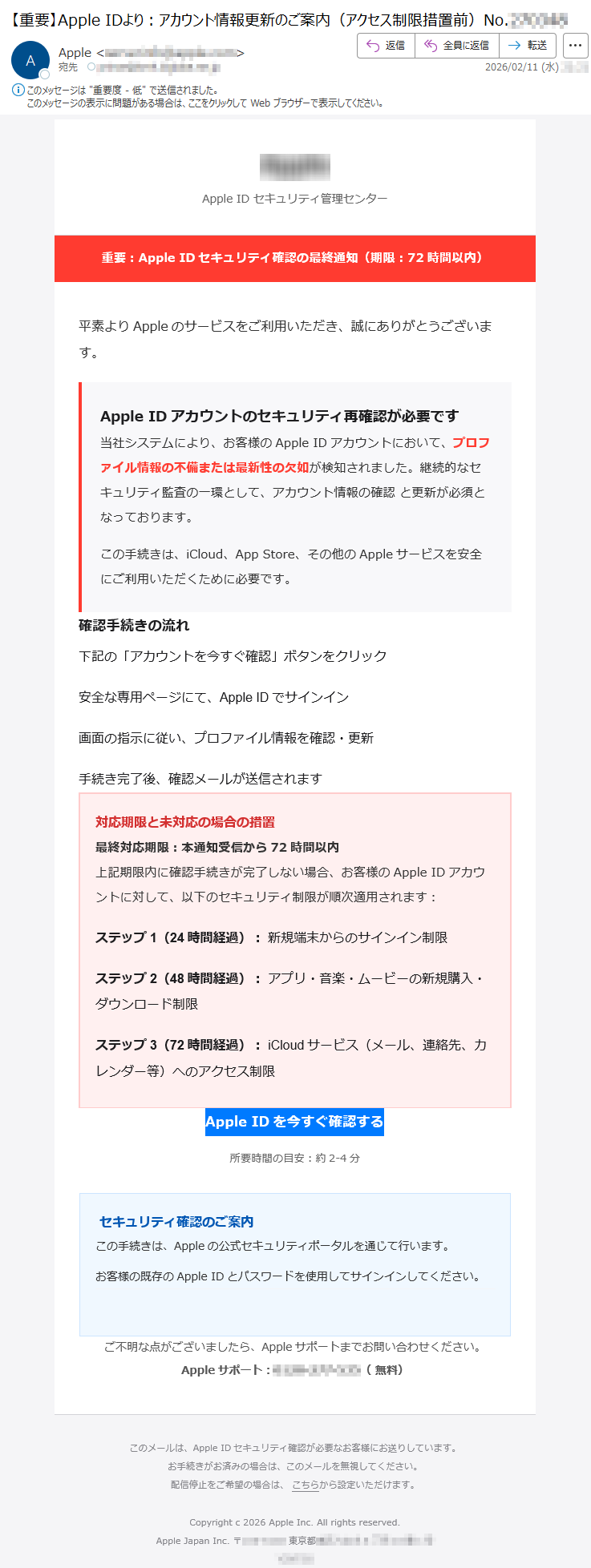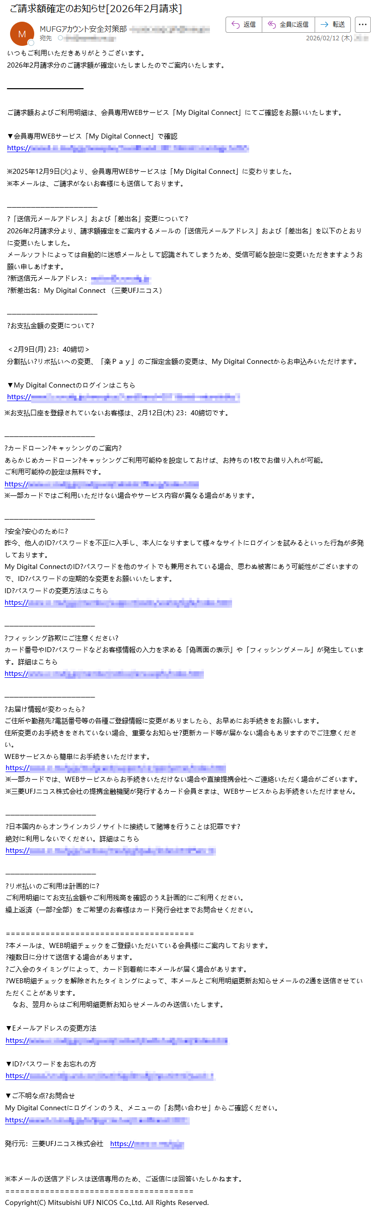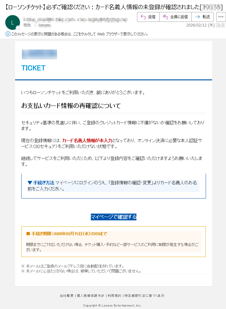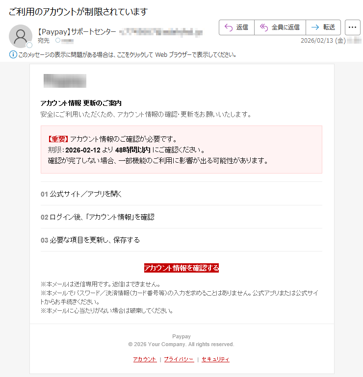![いつもMastercardをご利用いただき、誠にありがとうございます。日頃よりMastercardをご愛用いただき、厚く御礼申し上げます。このたび、お客様のアカウントの安全性を一層強化するため、セキュリティシステムの重要な更新を実施することとなりました。■認証手続きの方法下記のURLより、セキュリティ認証ページへアクセスしていただき、画面の指示に従って手続きを進めてください。[セキュリティ認証ページ]https://*****※本認証手続きは、お客様の大切な資産を保護するためのものです。※認証情報は最新の暗号化技術により、厳重に保護されます。■お問い合わせ窓口MastercardアシスタンスセンターTEL:*****(24時間・年中無休)今後とも、お客様に安心・安全なサービスをご提供できるよう、努めてまいります。引き続き、Mastercardをご愛顧賜りますよう、よろしくお願い申し上げます。敬具Mastercardセキュリティ管理部本メールは送信専用のアドレスから配信されています。このメールに返信いただいてもご回答できませんので、あらかじめご了承ください。*****](../../images/alert/2026/2m/nise_mail0209_14.png)