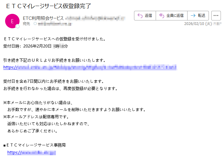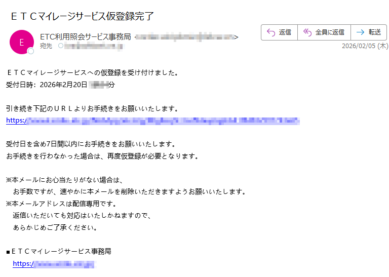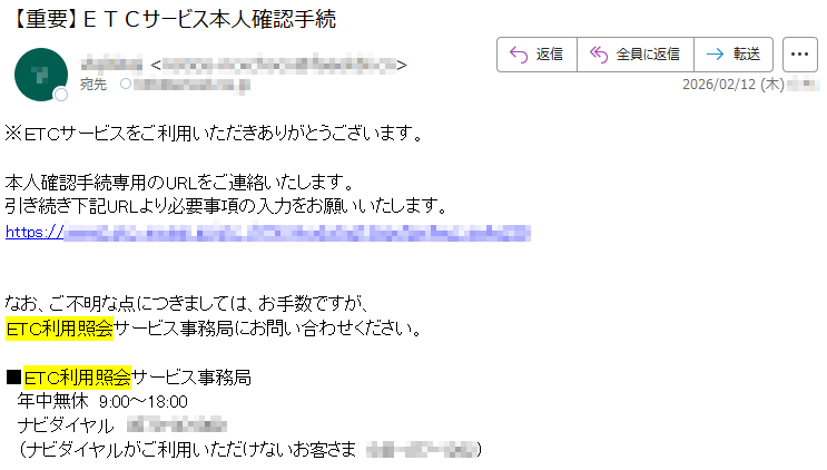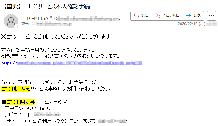 ETC利用照会サービスになりすました偽メール「件名:【重要】ETCサービス本人確認手続」(本偽メールは、実在の企業と無関係に送信されたものです)