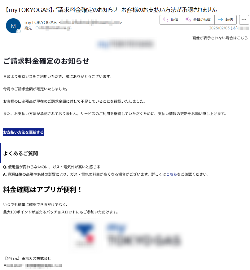 東京ガスになりすました偽メール「件名:【myTOKYOGAS】ご請求料金確定のお知らせ お客様のお支払い方法が承認されません」(本偽メールは、実在の企業と無関係に送信されたものです)