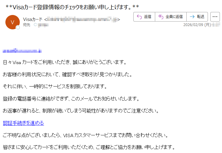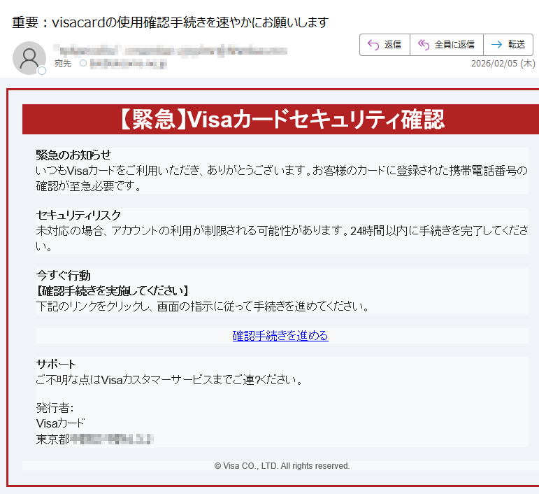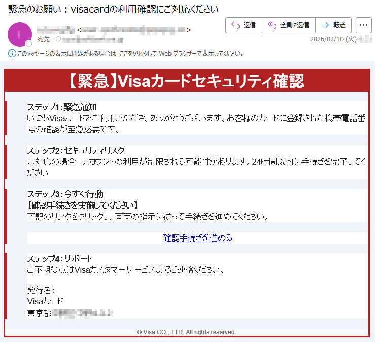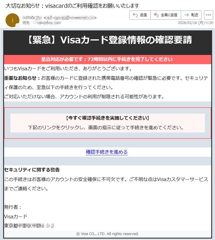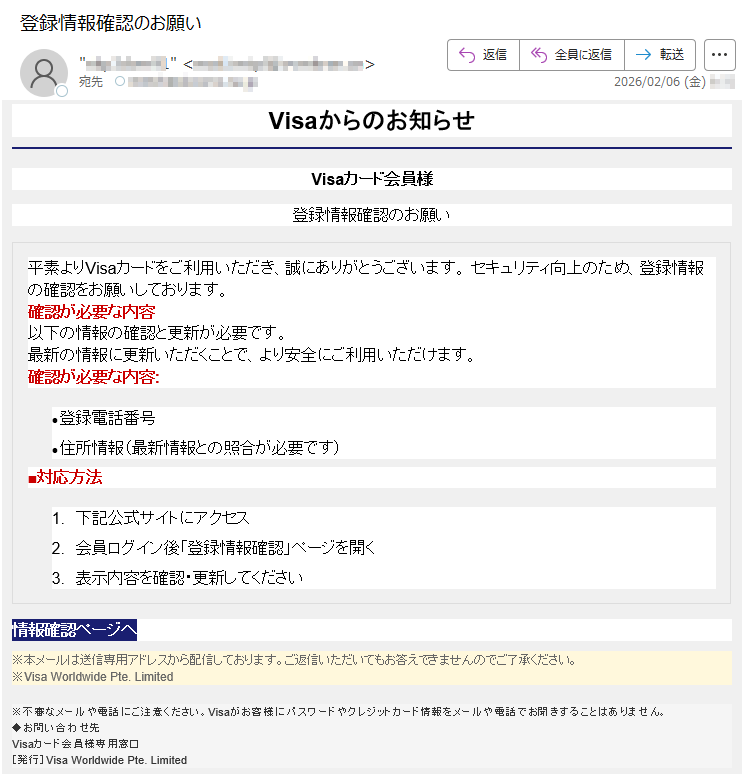 ![Visaからのお知らせVisaカード会員様登録情報確認のお願い平素よりVisaカードをご利用いただき、誠にありがとうございます。セキュリティ向上のため、登録情報の確認をお願いしております。確認が必要な内容以下の情報の確認と更新が必要です。最新の情報に更新いただくことで、より安全にご利用いただけます。確認が必要な内容:•登録電話番号•住所情報(最新情報との照合が必要です)■対応方法1.下記公式サイトにアクセス2.会員ログイン後「登録情報確認」ページを開く3.表示内容を確認・更新してください情報確認ページへ※本メールは送信専用アドレスから配信しております。ご返信いただいてもお答えできませんのでご了承ください。※VisaWorldwidePte.Limited※不審なメールや電話にご注意ください。Visaがお客様にパスワードやクレジットカード情報をメールや電話でお聞きすることはありません。◆お問い合わせ先Visaカード会員様専用窓口[発行]VisaWorldwidePte.Limited](../../images/alert/2026/2m/nise_mail0206_11.png)
