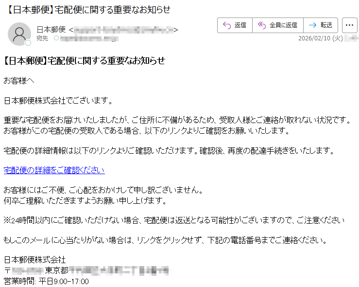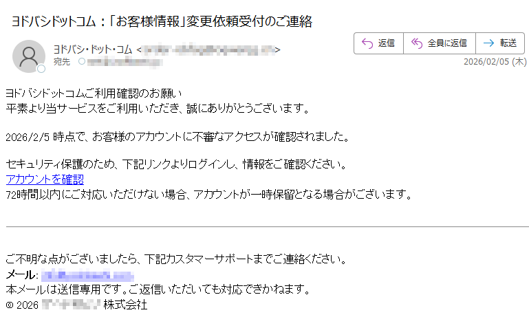 2026年2月3日現在、以下の迷惑メール・詐欺メールが送信されているので気をつけてください。