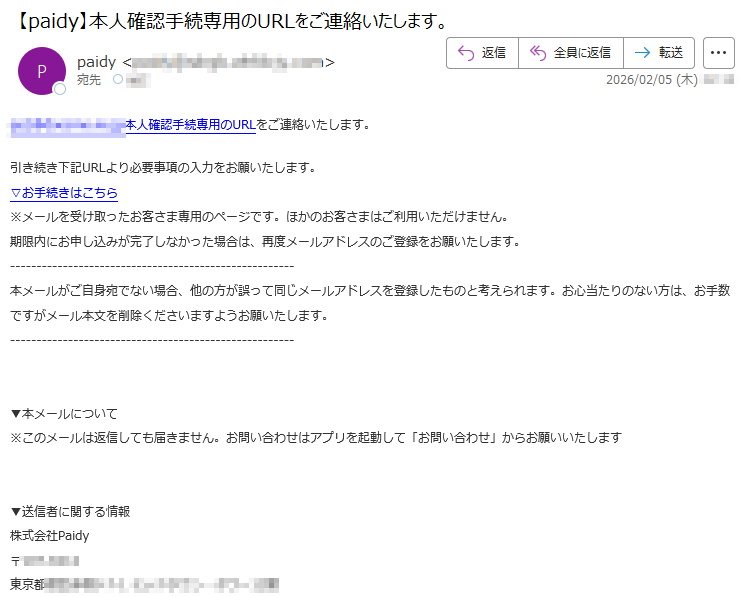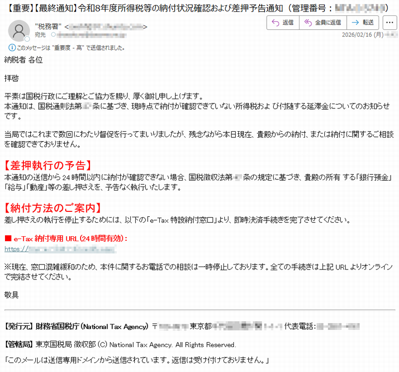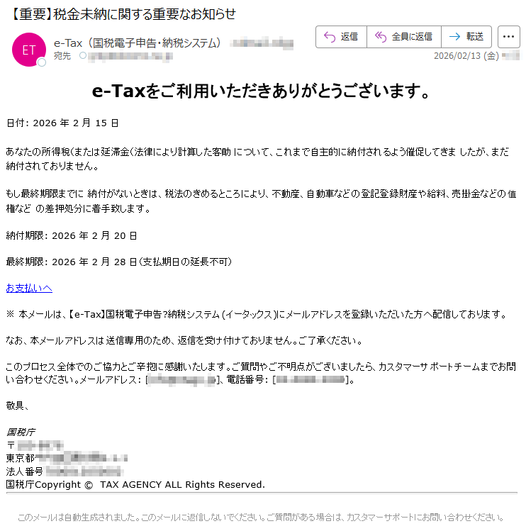 ![e-Taxをご利用いただきありがとうございます。日付:2026年2月15日あなたの所得稅(または延滞金(法律により計算した客勛について、これまで自主的に納付されるよう催促してきましたが、まだ納付されておりません。もし最終期限までに納付がないときは、税法のきめるところにより、不動産、自動車などの登記登録財産や給料、売掛金などの值権などの差押処分に着手致します。納付期限:2026年2月20日最終期限:2026年2月28日(支払期日の延長不可)お支払いへ※本メールは、【e-Tax】国税電子申告?納税システム(イータックス)にメールアドレスを登録いただいた方へ配信しております。なお、本メールアドレスは送信専用のため、返信を受け付けておりません。ご了承ください。このプロセス全体でのご協力とご辛抱に感謝いたします。ご質問やご不明点がございましたら、カスタマーサポートチームまでお問い合わせください。メールアドレス:[*****]、電話番号:[*****]。敬具、国税庁〒*****東京都*****法人番号*****国税庁Copyright©TAXAGENCYALLRightsReserved.このメールは自動生成されました。このメールに返信しないでください。ご質問がある場合は、カスタマーサポートにお問い合わせください。](../../images/alert/2026/2m/nise_mail0213_22.png)