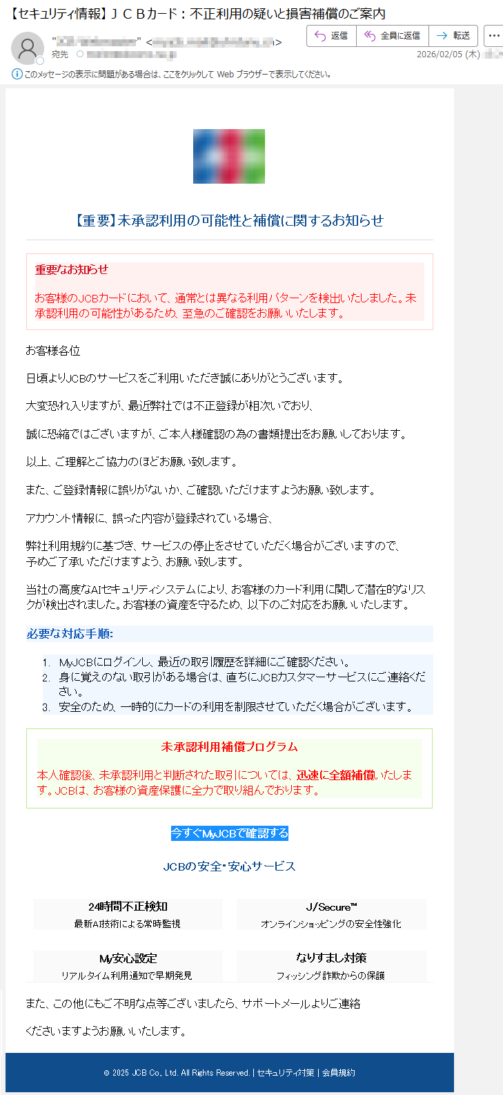 JCBカードになりすました偽メール「件名:JCBカード】ショッピングご利用のお知らせ」(本偽メールは、実在の企業と無関係に送信されたものです)