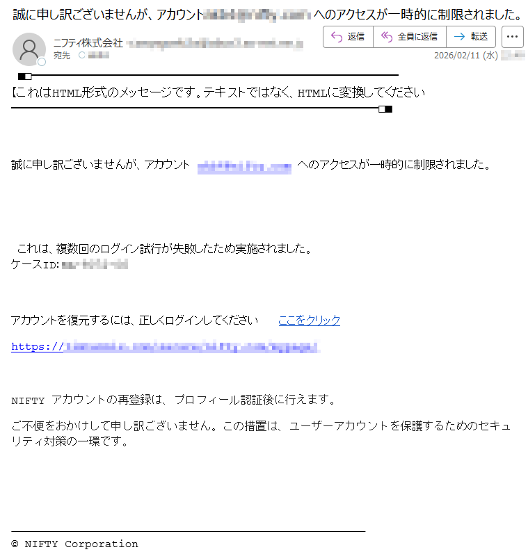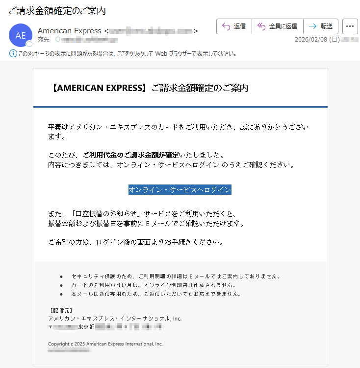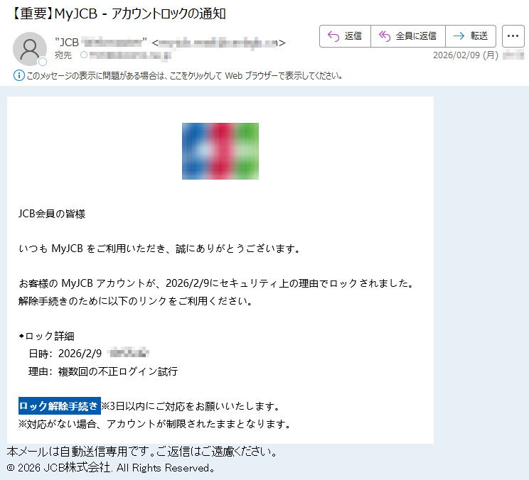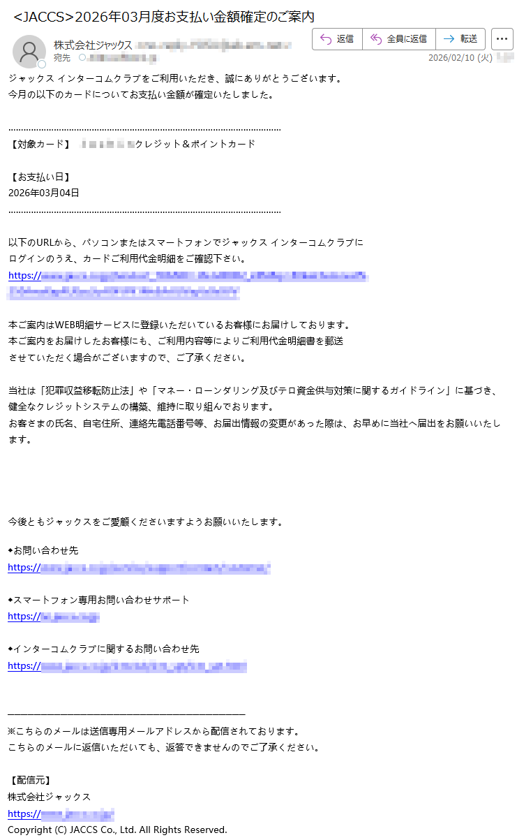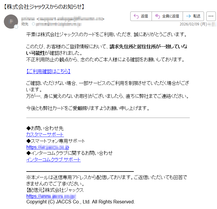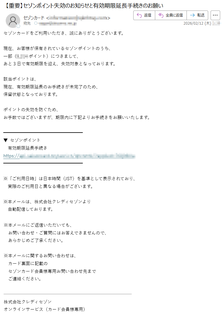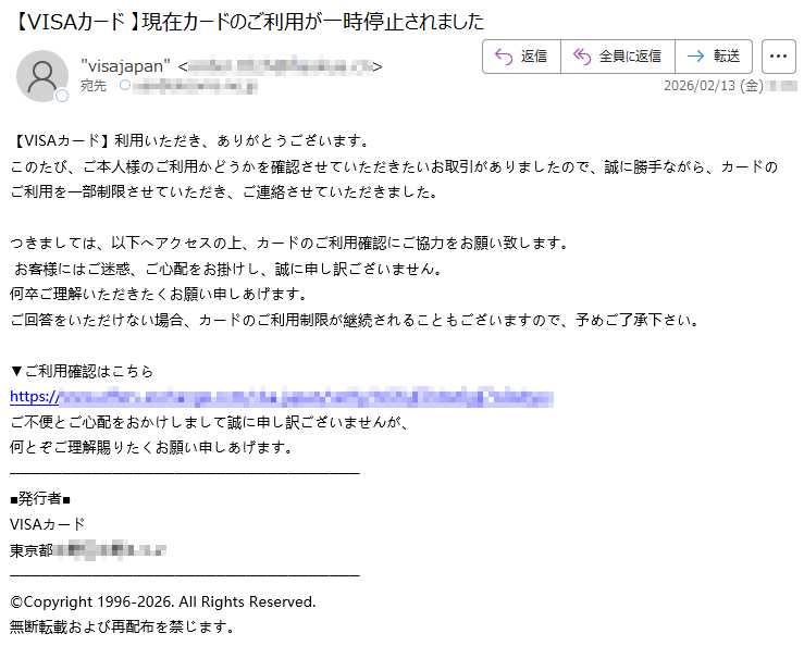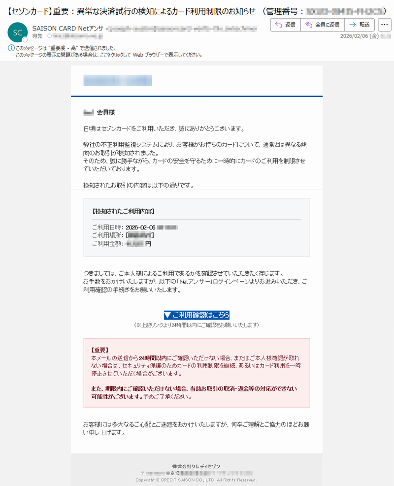 ![SAISONCARD*****会員様日頃はセゾンカードをご利用いただき、誠にありがとうございます。弊社の不正利用監視システムにより、お客様がお持ちのカードについて、通常とは異なる傾向のお取引が検知されました。そのため、誠に勝手ながら、カードの安全を守るために一時的にカードのご利用を制限させていただいております。検知されたお取引の内容は以下の通りです。【検知されたご利用内容】ご利用日時:2026-02-06*****ご利用場所:[*****]ご利用金額:*****円つきましては、ご本人様によるご利用であるかを確認させていただきたく存じます。お手数をおかけいたしますが、以下の「Netアンサー」ログインページよりお進みいただき、ご利用確認の手続きをお願いいたします。▼ご利用確認はこちら(※上記リンクより24時間以内にご確認をお願いいたします)【重要】本メールの送信から24時間以内にご確認いただけない場合、またはご本人様確認が取れない場合は、セキュリティ保護のためカードの利用制限を継続、あるいはカード利用を一時停止させていただく場合がございます。また、期限内にご確認いただけない場合、当該お取引の取消・返金等の対応ができない可能性がございます。予めご了承ください。お客様には多大なるご心配とご迷惑をおかけいたしますが、何卒ご理解とご協力のほどお願い申し上げます。株式会社クレディセゾン〒*****東京都*****Copyright©CREDITSAISONCO.,LTD.AllRightsReserved.](../../images/alert/2026/2m/nise_mail0206_08.png)
