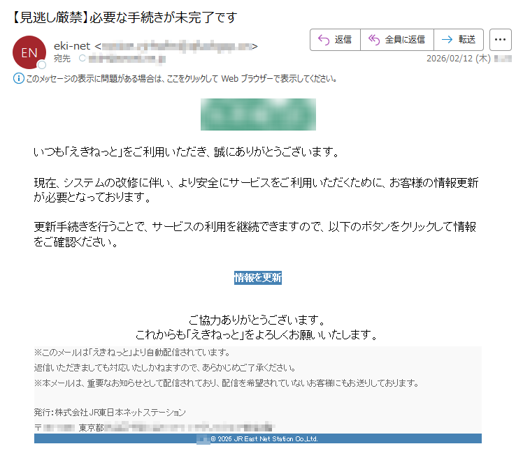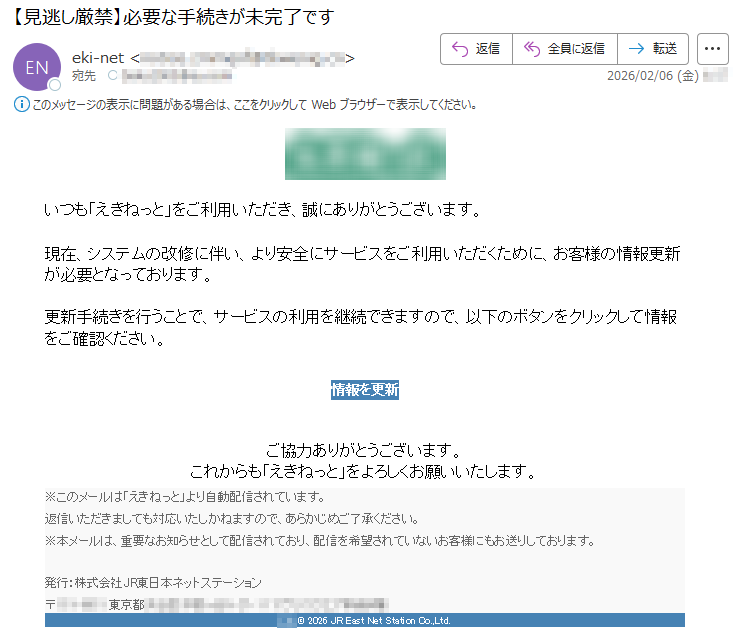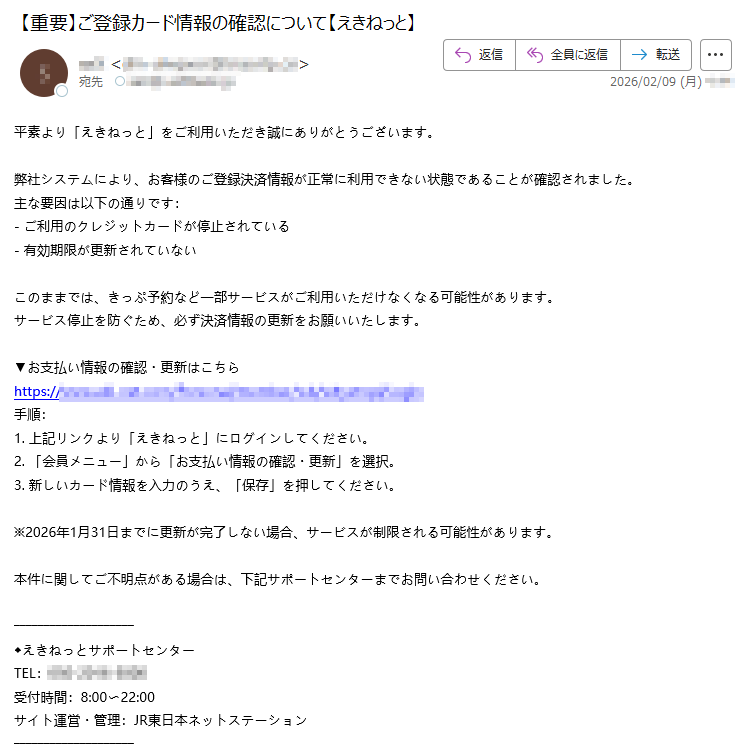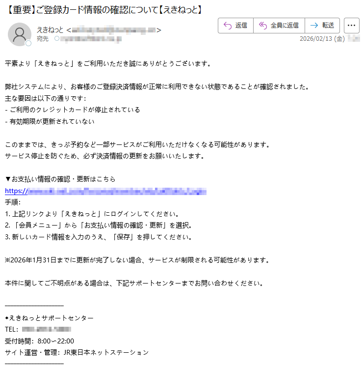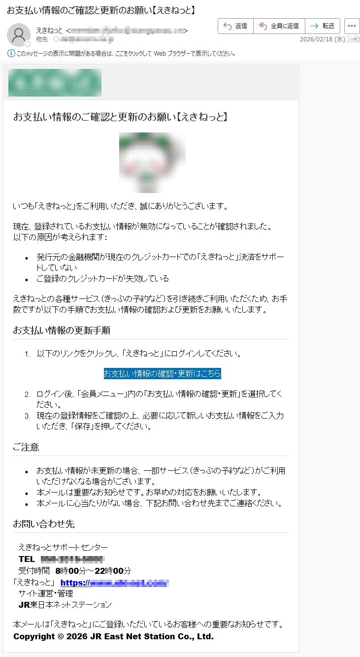 えきねっとになりすました偽メール「件名:お支払い情報のご確認と更新のお願い【えきねっと】」(本偽メールは、実在の企業と無関係に送信されたものです)