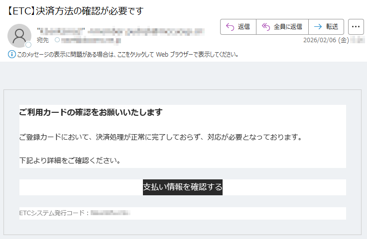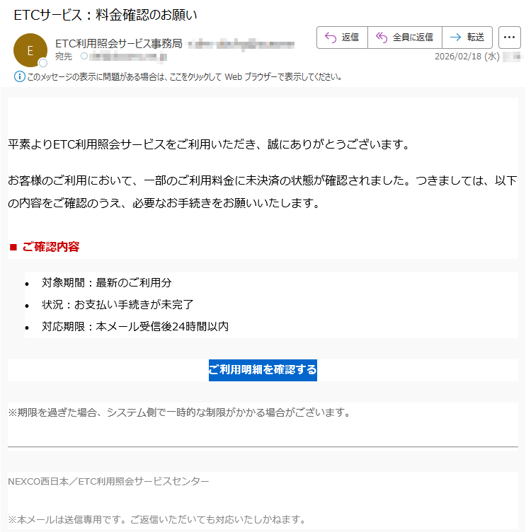ETC利用照会サービスになりすました偽メール「件名:【至急】ご利用を継続いただくためのお願い」(本偽メールは、実在の企業と無関係に送信されたものです)