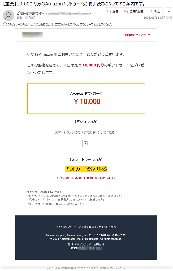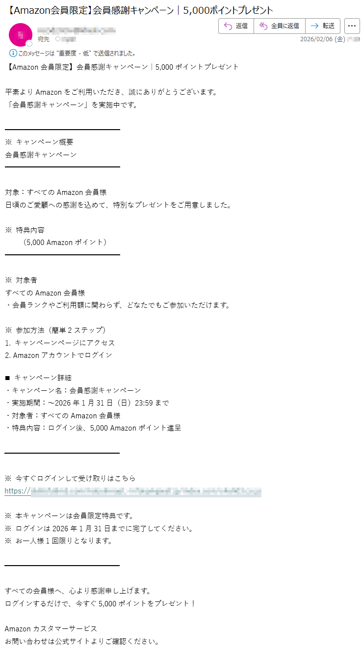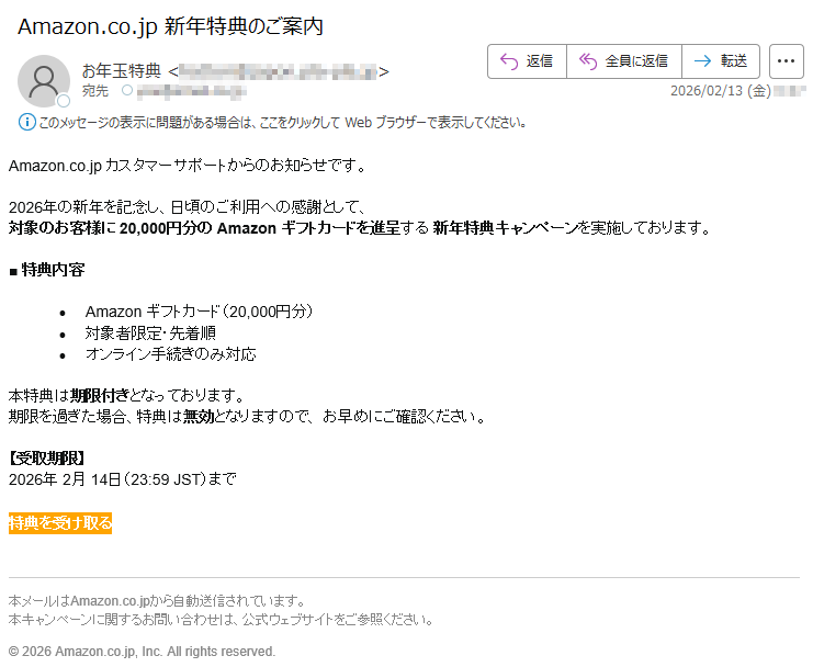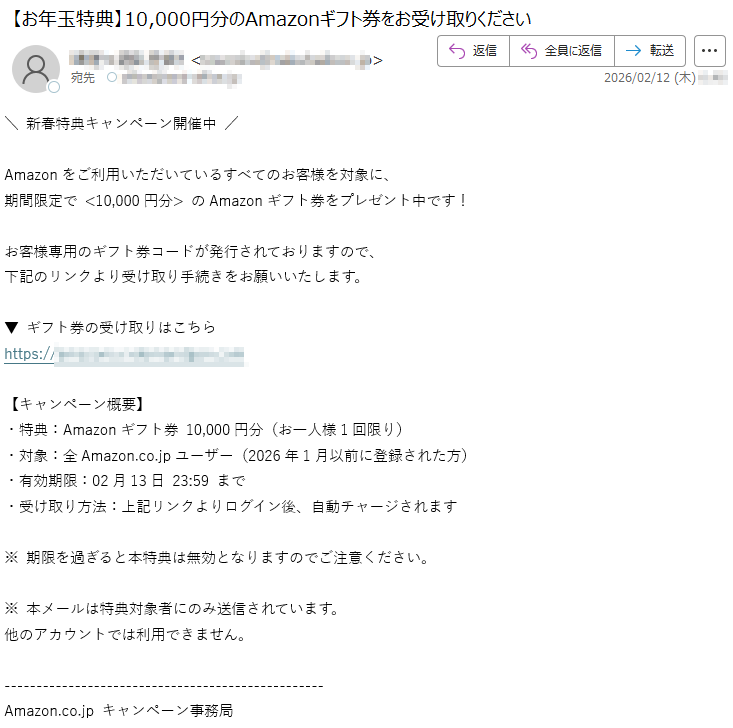アマゾンになりすました偽メール「件名:【新春特典】5,000円分 Amazon ギフトカードのご案内」(本偽メールは、実在の企業と無関係に送信されたものです)