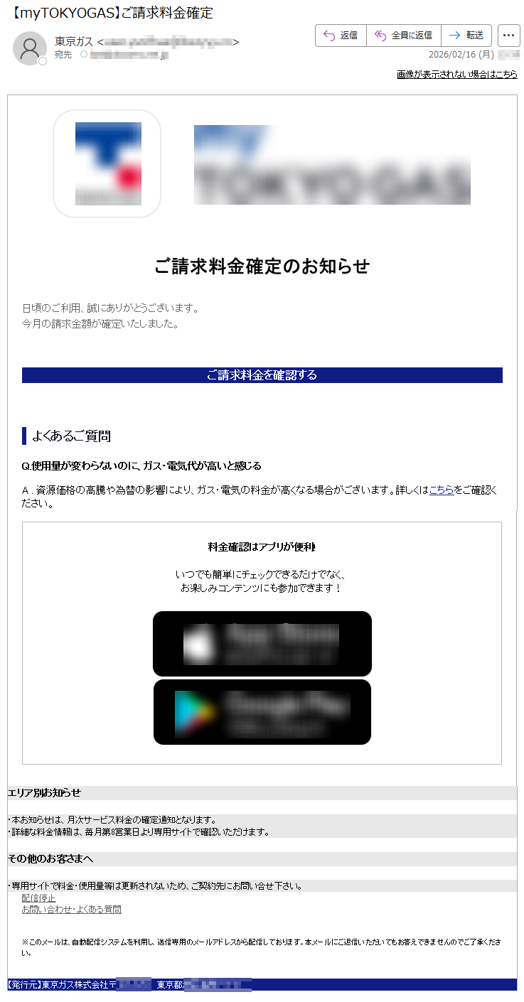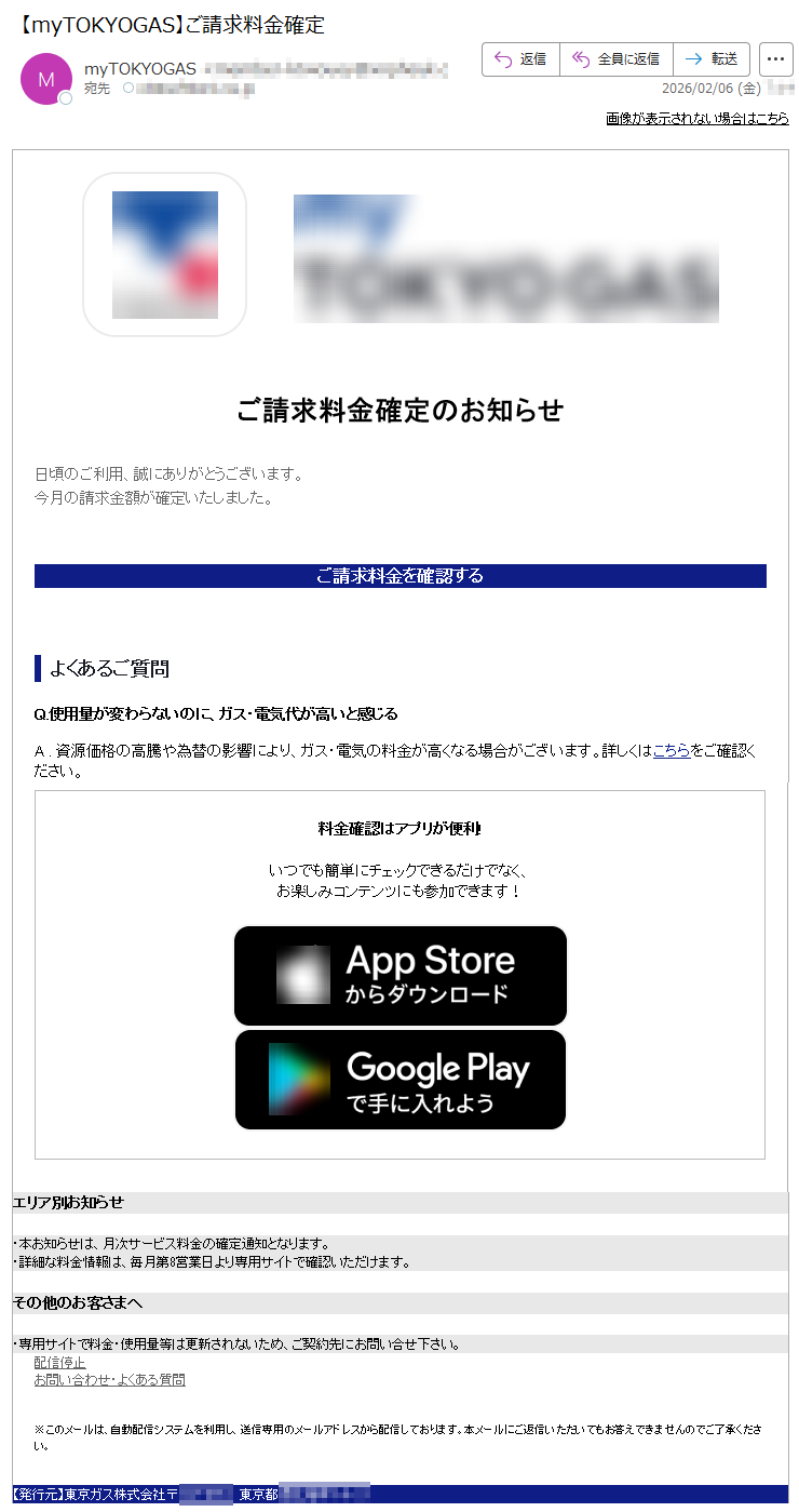【myTOKYOGAS】ご請求料金確定のお知らせ(自動配信メール)