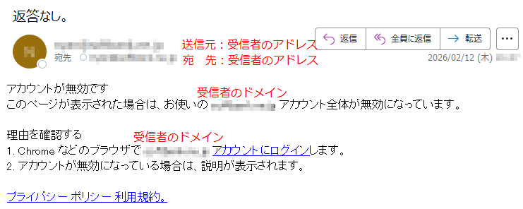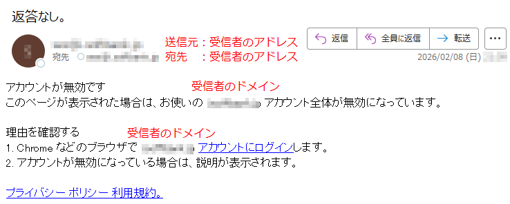 「アカウントが無効」としてアカウントにログインを要求するメール「件名:返答なし。」