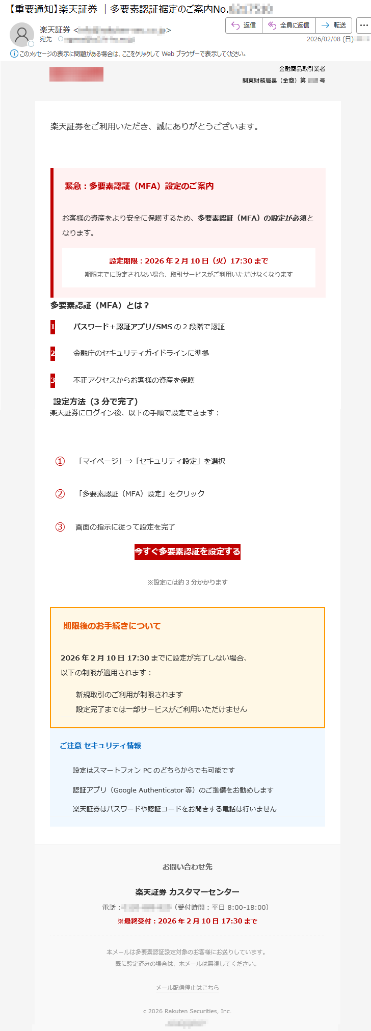 【最終警告】MFA未設定のお客様:取引権限停止まであと7日|オンライン手続きの即時完了を