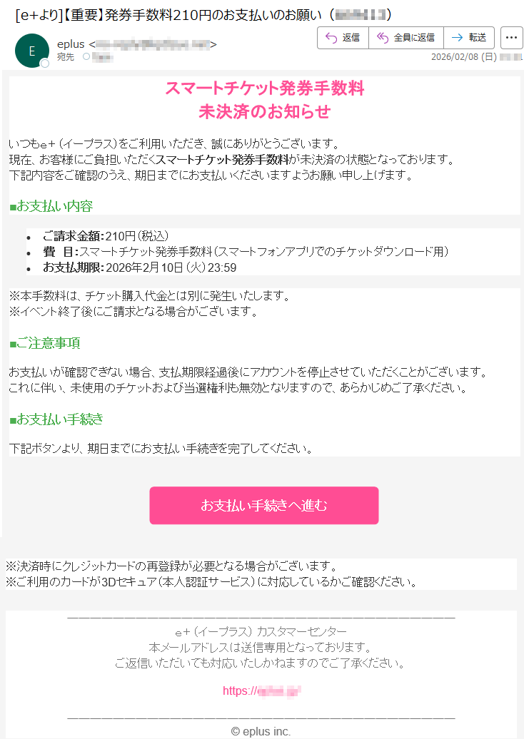 イープラスになりすました偽メール「件名:【e+より】重要:会員情報更新のお願い」(本偽メールは、実在の企業と無関係に送信されたものです)