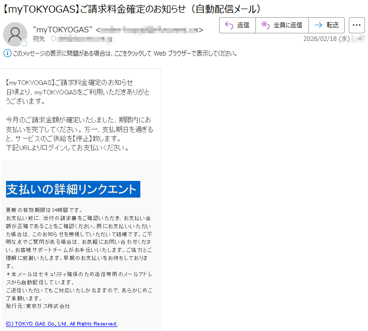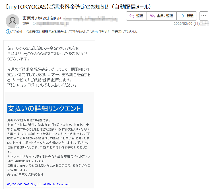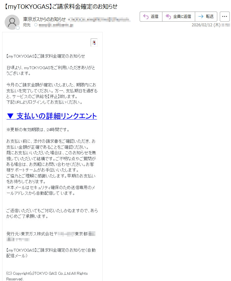 東京ガスになりすました偽メール「件名:【myTOKYOGAS】ご請求料金確定」(本偽メールは、実在の企業と無関係に送信されたものです)