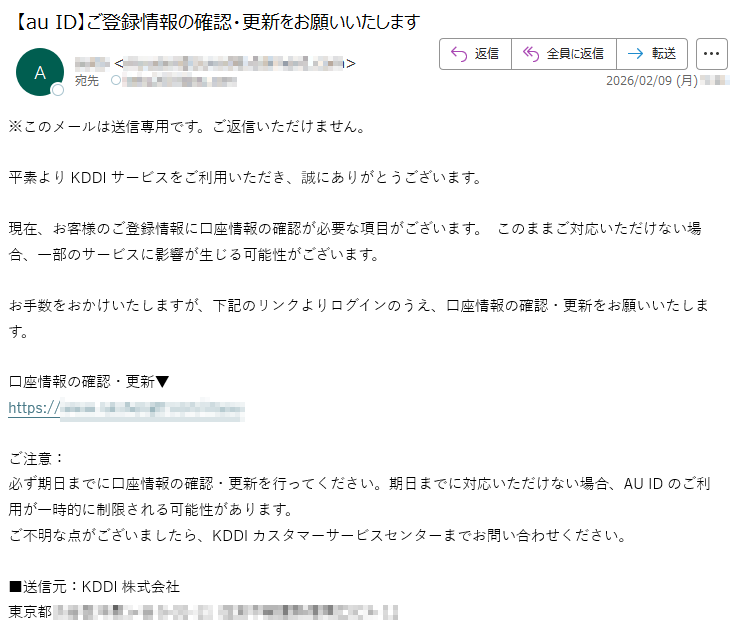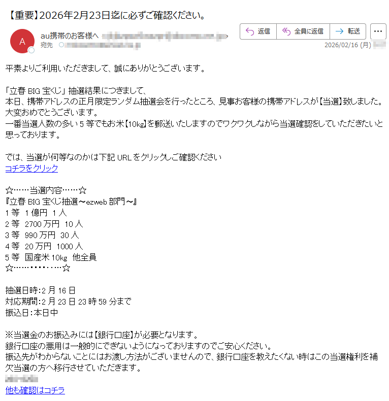 auになりすました偽メール「件名:【重要】2026年2月23日迄に必ずご確認ください。」(本偽メールは、実在の企業と無関係に送信されたものです)