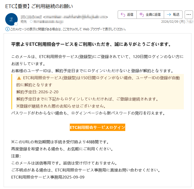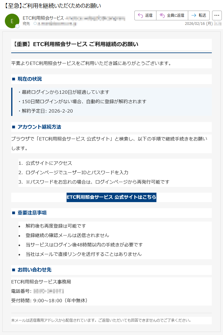 ETC利用照会サービスになりすました偽メール「件名:【重要】ETCカード契約更新のお知らせ」(本偽メールは、実在の企業と無関係に送信されたものです)