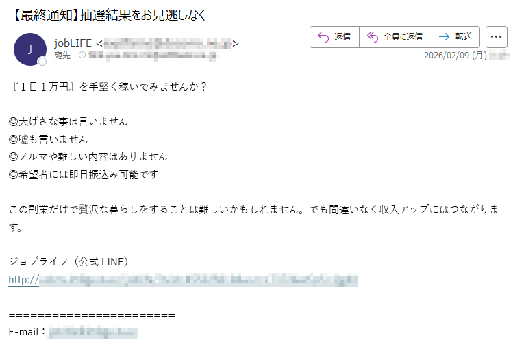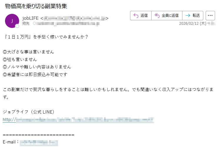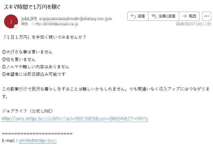 ジョブライフになりすました偽メール「件名:スキマ時間で1万円を稼ぐ」(本偽メールは、実在の企業と無関係に送信されたものです)