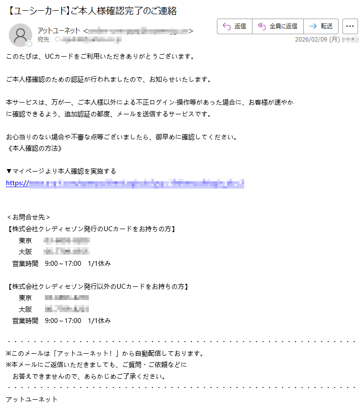 UCカードになりすました偽メール「件名:UCカード不正アクセスリスク検知による本人認証のお願い」(本偽メールは、実在の企業と無関係に送信されたものです)