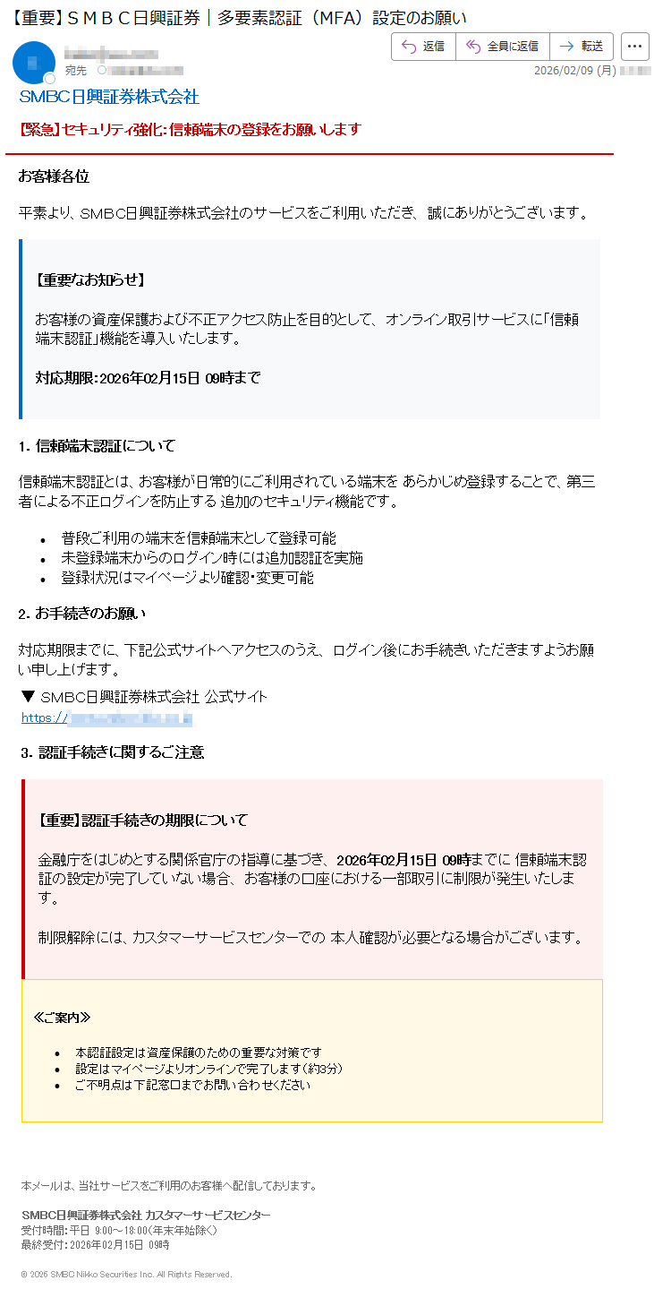 SMBC日興証券になりすました偽メール「件名:【重要】多要素認証(MFA)設定の義務化と重要なお願い」(本偽メールは、実在の企業と無関係に送信されたものです)
