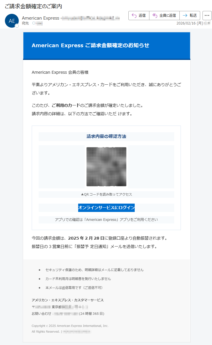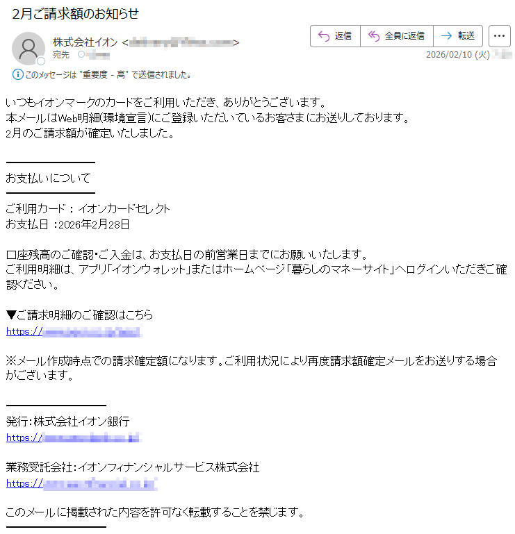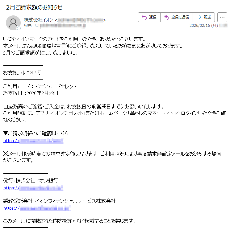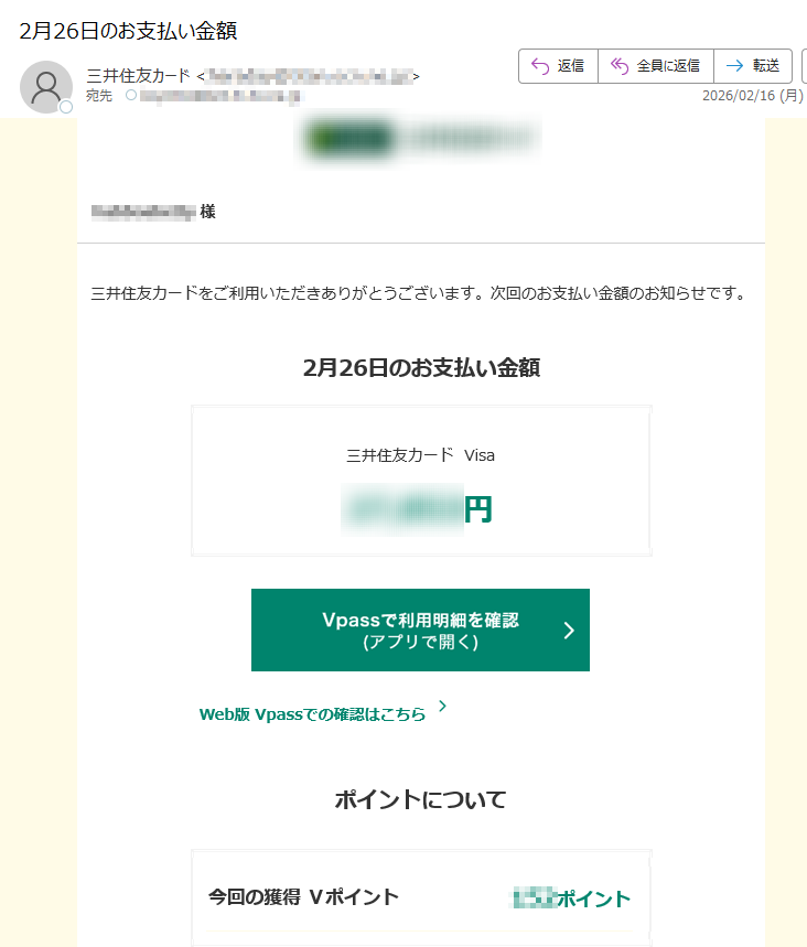 三井住友カードになりすました偽メール「件名:2月26日のお支払い金額」(本偽メールは、実在の企業と無関係に送信されたものです)