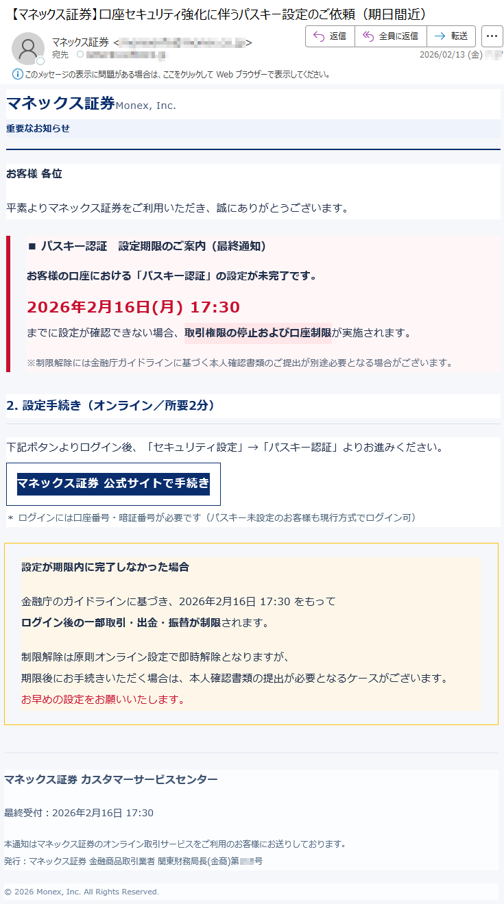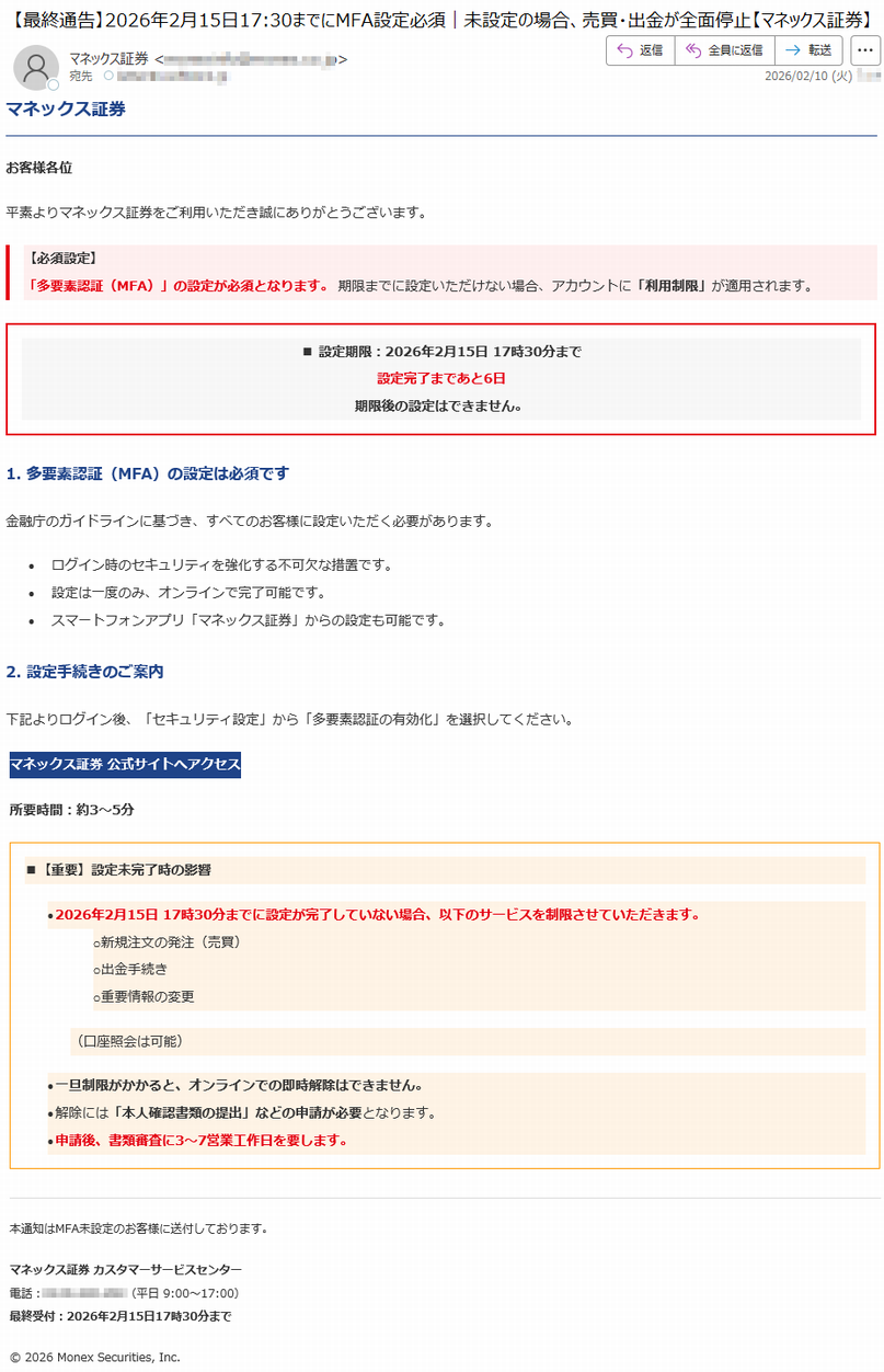 【緊急】マネックス証券|多要素認証(MFA)裾定期限切迫No.*****