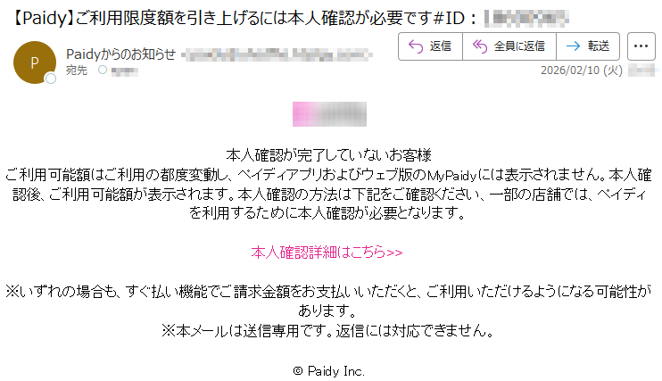 ペイディになりすました偽メール「件名:【Paidy】11周年を記念して11,000円分ギフトをお届けしますNo.*****」(本偽メールは、実在の企業と無関係に送信されたものです)
