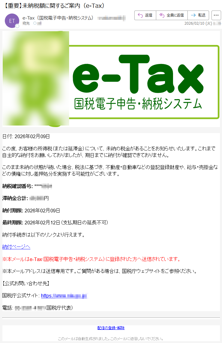 ![e-Taxをご利用いただきありがとうございます。日付:2026年2月15日あなたの所得稅(または延滞金(法律により計算した客勛について、これまで自主的に納付されるよう催促してきましたが、まだ納付されておりません。もし最終期限までに納付がないときは、税法のきめるところにより、不動産、自動車などの登記登録財産や給料、売掛金などの值権などの差押処分に着手致します。納付期限:2026年2月20日最終期限:2026年2月28日(支払期日の延長不可)お支払いへ※本メールは、【e-Tax】国税電子申告?納税システム(イータックス)にメールアドレスを登録いただいた方へ配信しております。なお、本メールアドレスは送信専用のため、返信を受け付けておりません。ご了承ください。このプロセス全体でのご協力とご辛抱に感謝いたします。ご質問やご不明点がございましたら、カスタマーサポートチームまでお問い合わせください。メールアドレス:[*****]、電話番号:[*****]。敬具、国税庁〒*****東京都*****法人番号*****国税庁Copyright©TAXAGENCYALLRightsReserved.このメールは自動生成されました。このメールに返信しないでください。ご質問がある場合は、カスタマーサポートにお問い合わせください。](../../images/alert/2026/2m/nise_mail0218_08.png)