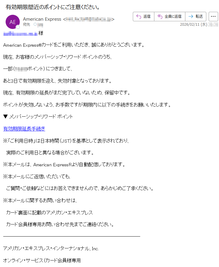 アメリカン・エキスプレス・カードになりすました偽メール「件名:メンバーシップ・リワード ポイントがまもなく失効予定です(有効期限延長のご案内)」(本偽メールは、実在の企業と無関係に送信されたものです)