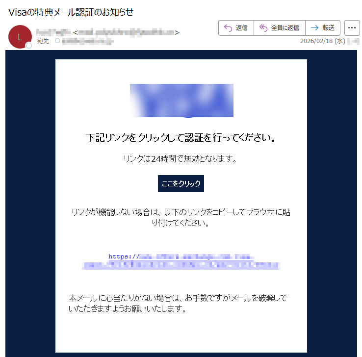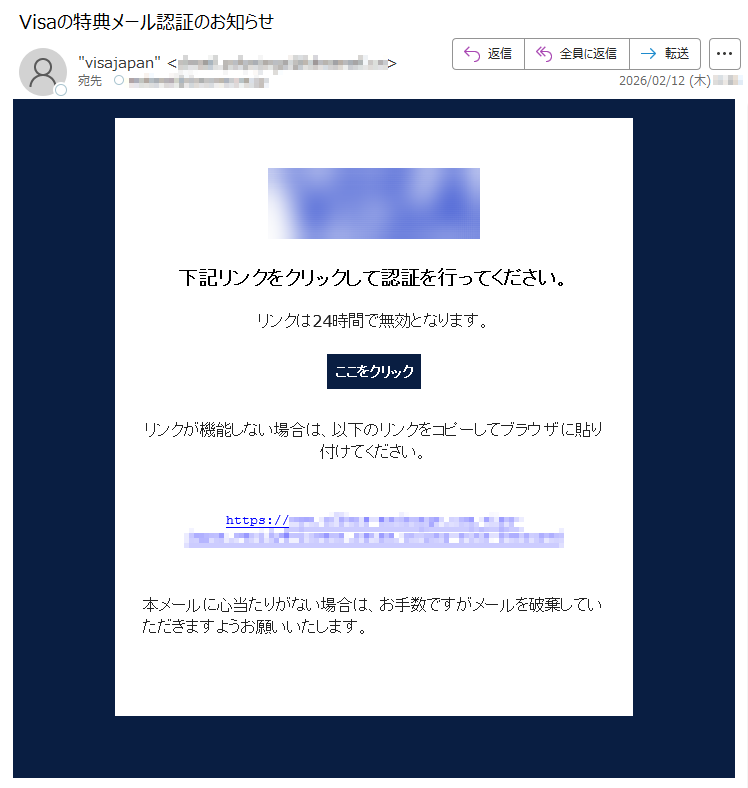 VISAカードになりすました偽メール「件名:Visaの特典メール認証のお知らせ」(本偽メールは、実在の企業と無関係に送信されたものです)