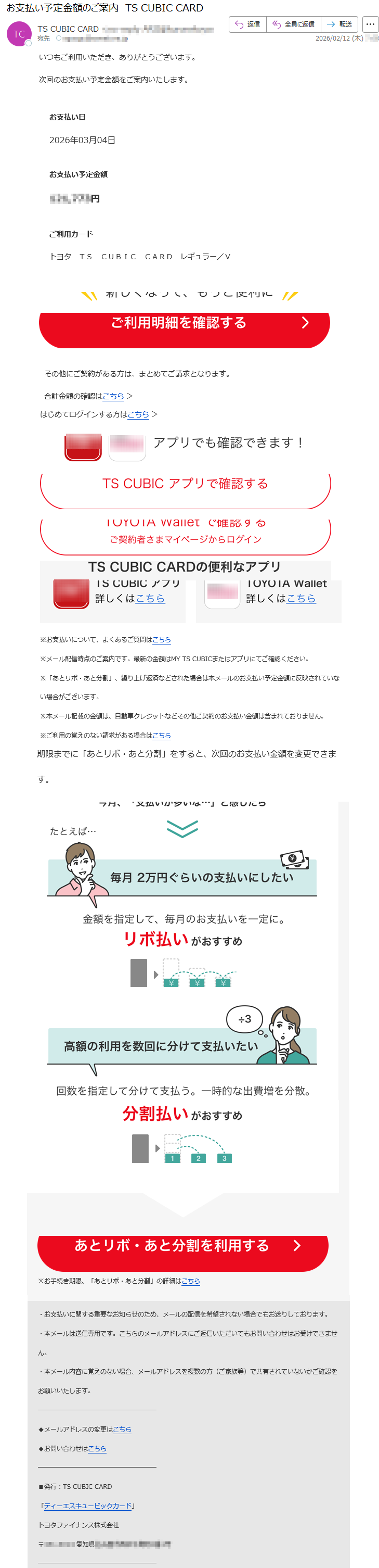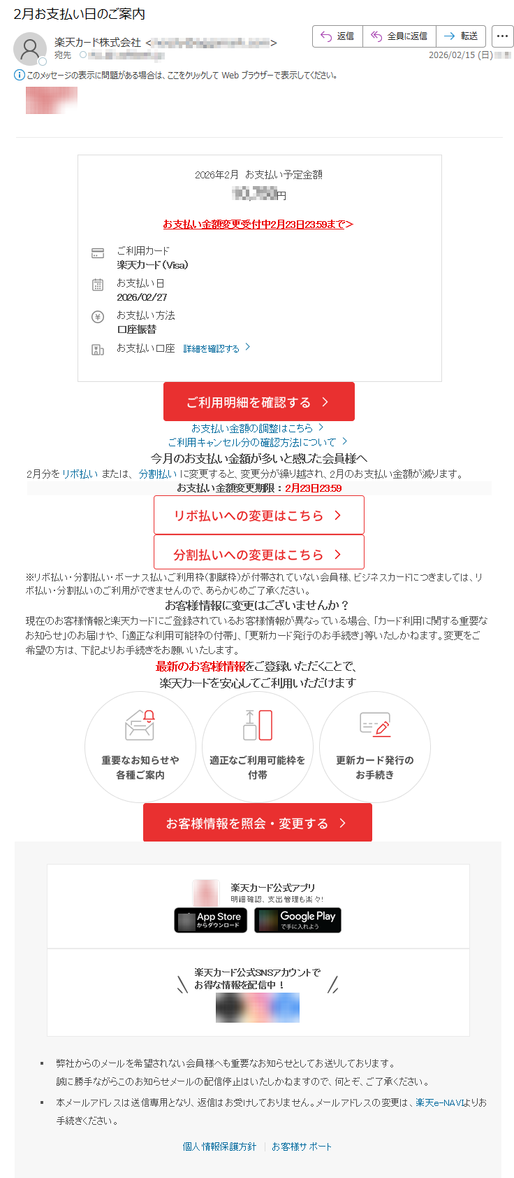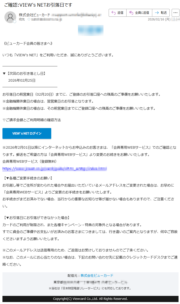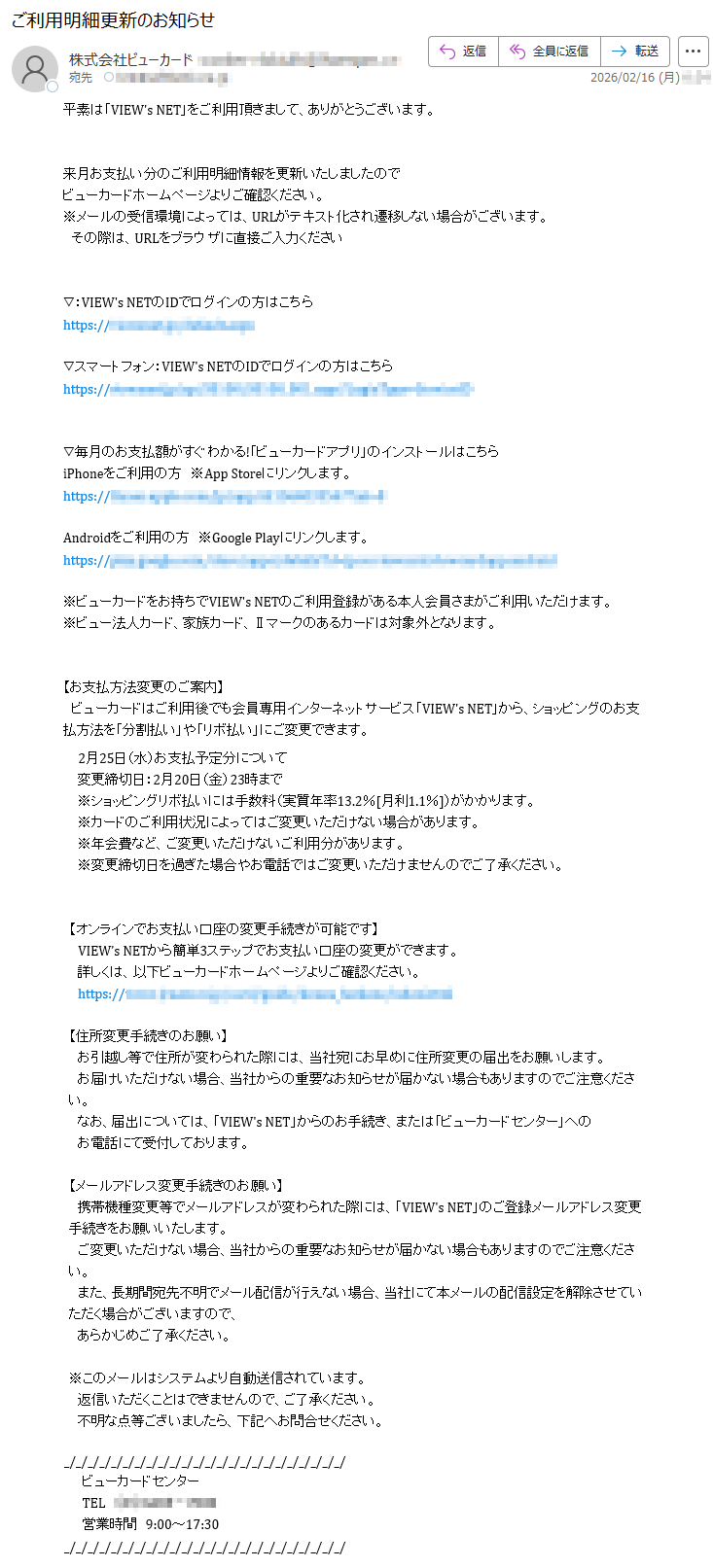 ![平素は「VIEW'sNET」をご利用頂きまして、ありがとうございます。来月お支払い分のご利用明細情報を更新いたしましたのでビューカードホームページよりご確認ください。※メールの受信環境によっては、URLがテキスト化され遷移しない場合がございます。その際は、URLをブラウザに直接ご入力ください▽:VIEW'sNETのIDでログインの方はこちらhttps://*****▽スマートフォン:VIEW'sNETのIDでログインの方はこちらhttps://*****▽毎月のお支払額がすぐわかる!「ビューカードアプリ」のインストールはこちらiPhoneをご利用の方※AppStoreにリンクします。https://*****Androidをご利用の方※GooglePlayにリンクします。https://*****※ビューカードをお持ちでVIEW'sNETのご利用登録がある本人会員さまがご利用いただけます。※ビュー法人カード、家族カード、Ⅱマークのあるカードは対象外となります。【お支払方法変更のご案内】ビューカードはご利用後でも会員専用インターネットサービス「VIEW'sNET」から、ショッピングのお支払方法を「分割払い」や「リボ払い」にご変更できます。2月25日(水)お支払予定分について変更締切日:2月20日(金)23時まで※ショッピングリボ払いには手数料(実質年率13.2%[月利1.1%])がかかります。※カードのご利用状況によってはご変更いただけない場合があります。※年会費など、ご変更いただけないご利用分があります。※変更締切日を過ぎた場合やお電話ではご変更いただけませんのでご了承ください。【オンラインでお支払い口座の変更手続きが可能です】VIEW’sNETから簡単3ステップでお支払い口座の変更ができます。詳しくは、以下ビューカードホームページよりご確認ください。https://*****【住所変更手続きのお願い】お引越し等で住所が変わられた際には、当社宛にお早めに住所変更の届出をお願いします。お届けいただけない場合、当社からの重要なお知らせが届かない場合もありますのでご注意ください。なお、届出については、「VIEW'sNET」からのお手続き、または「ビューカードセンター」へのお電話にて受付しております。【メールアドレス変更手続きのお願い】携帯機種変更等でメールアドレスが変わられた際には、「VIEW'sNET」のご登録メールアドレス変更手続きをお願いいたします。ご変更いただけない場合、当社からの重要なお知らせが届かない場合もありますのでご注意ください。また、長期間宛先不明でメール配信が行えない場合、当社にて本メールの配信設定を解除させていただく場合がございますので、あらかじめご了承ください。※このメールはシステムより自動送信されています。返信いただくことはできませんので、ご了承ください。不明な点等ございましたら、下記へお問合せください。ビューカードセンターTEL*****営業時間9:00~17:30](../../images/alert/2026/2m/nise_mail0216_09.png)