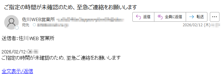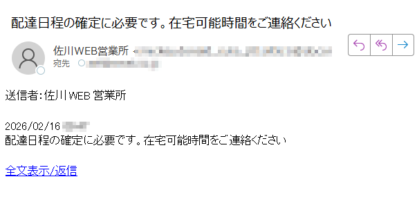 佐川急便になりすました偽メール「件名:配達日程の確定に必要です。在宅可能時間をご連絡ください」(本偽メールは、実在の企業と無関係に送信されたものです)