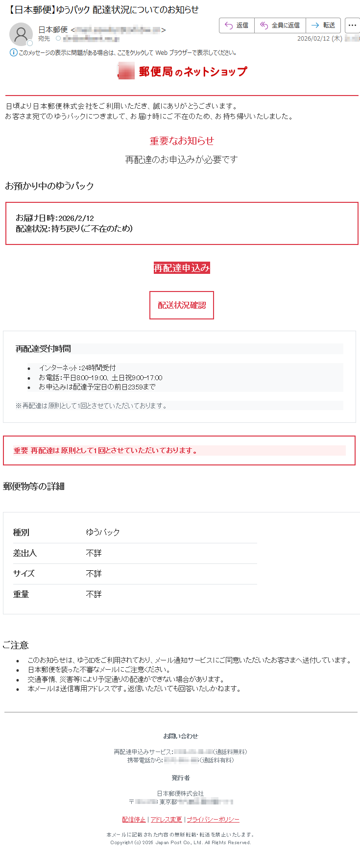 お荷物再配達のご案内 / Shipment Re-Delivery Reminder