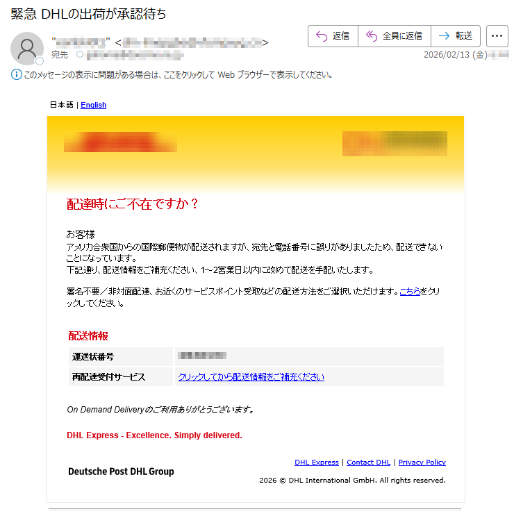 DHLになりすました偽メール「件名:お荷物再配達のご案内 / Shipment Re-Delivery Reminder」(本偽メールは、実在の企業と無関係に送信されたものです)