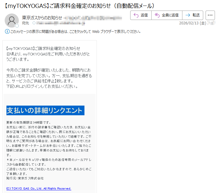 東京ガスになりすました偽メール「件名:【myTOKYOGAS】ご請求料金確定のお知らせ(自動配信メール)」(本偽メールは、実在の企業と無関係に送信されたものです)