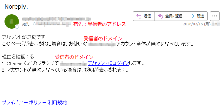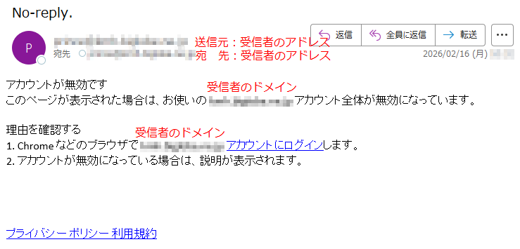 「アカウントが無効」としてアカウントにログインを要求するメール「件名:No-reply.」