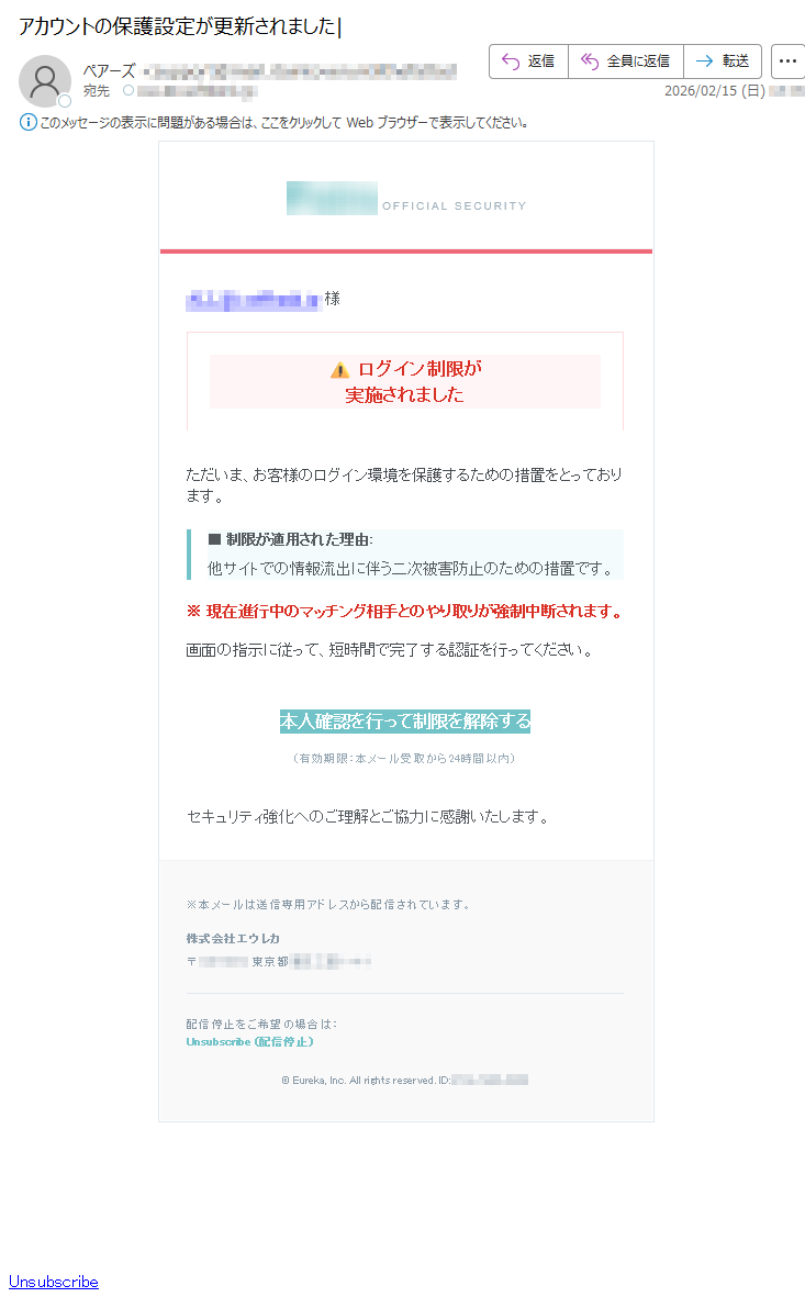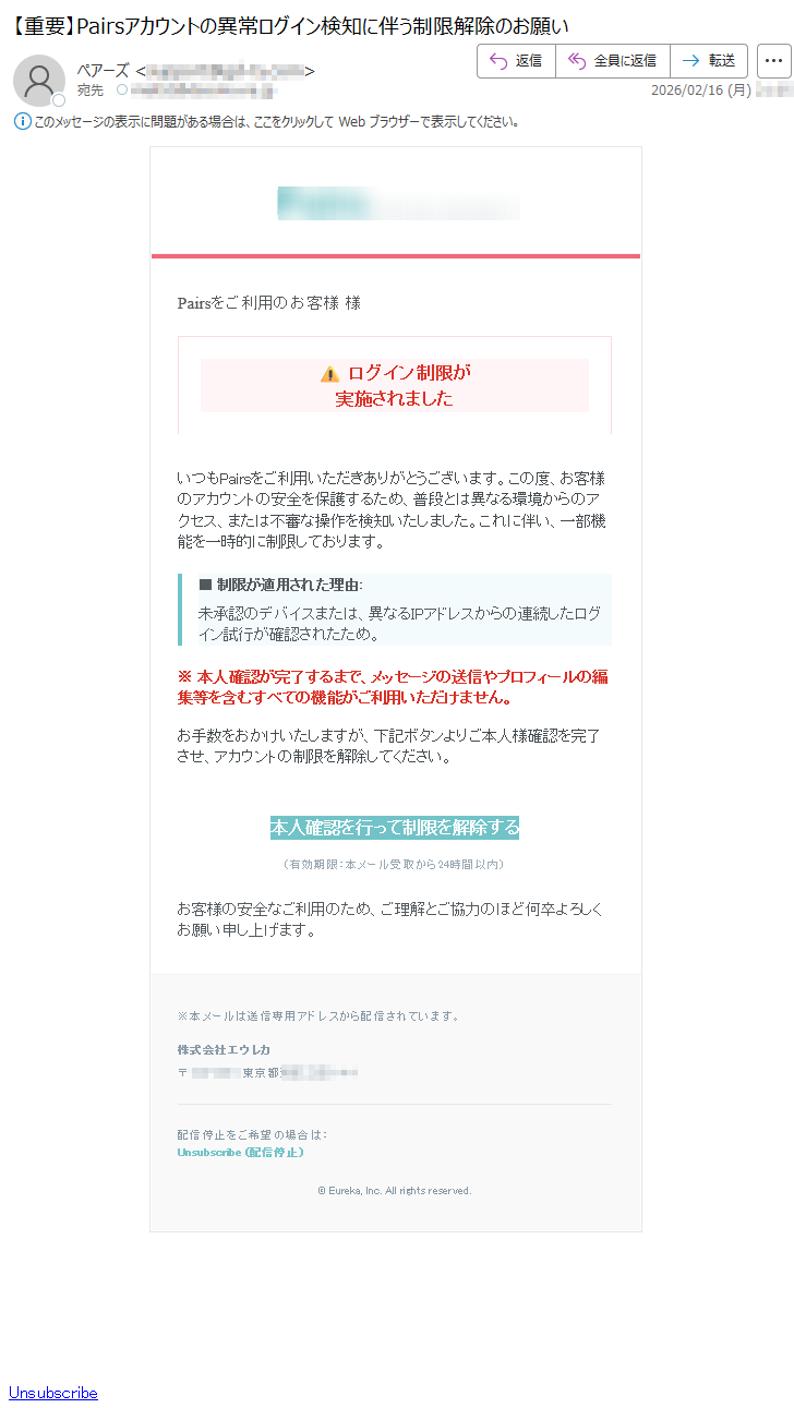 ペアーズになりすました偽メール「件名:【重要】Pairsアカウントの異常ログイン検知に伴う制限解除のお願い」(本偽メールは、実在の企業と無関係に送信されたものです)