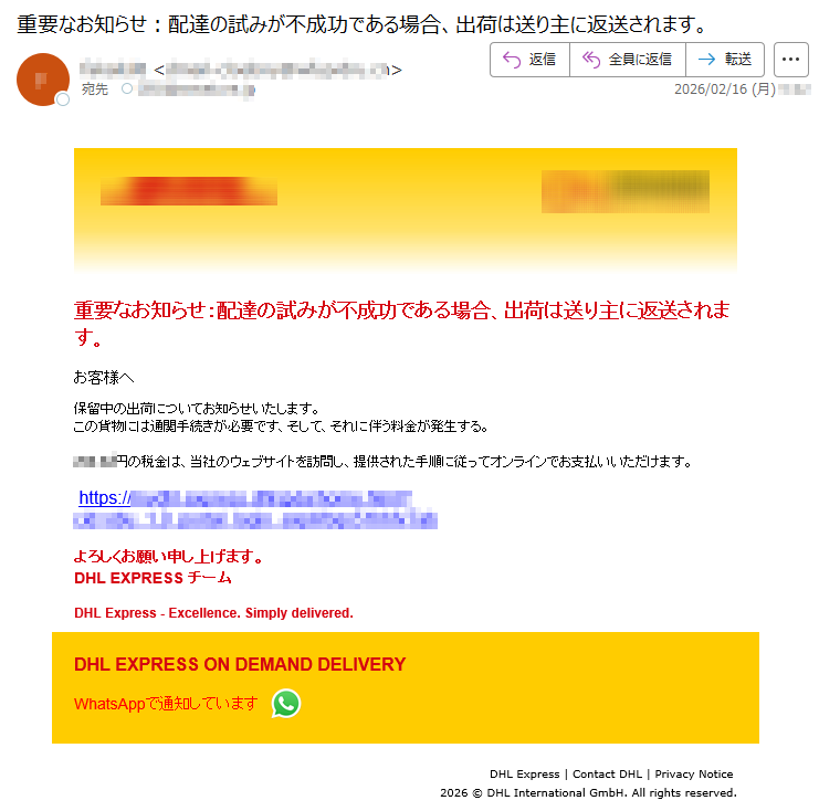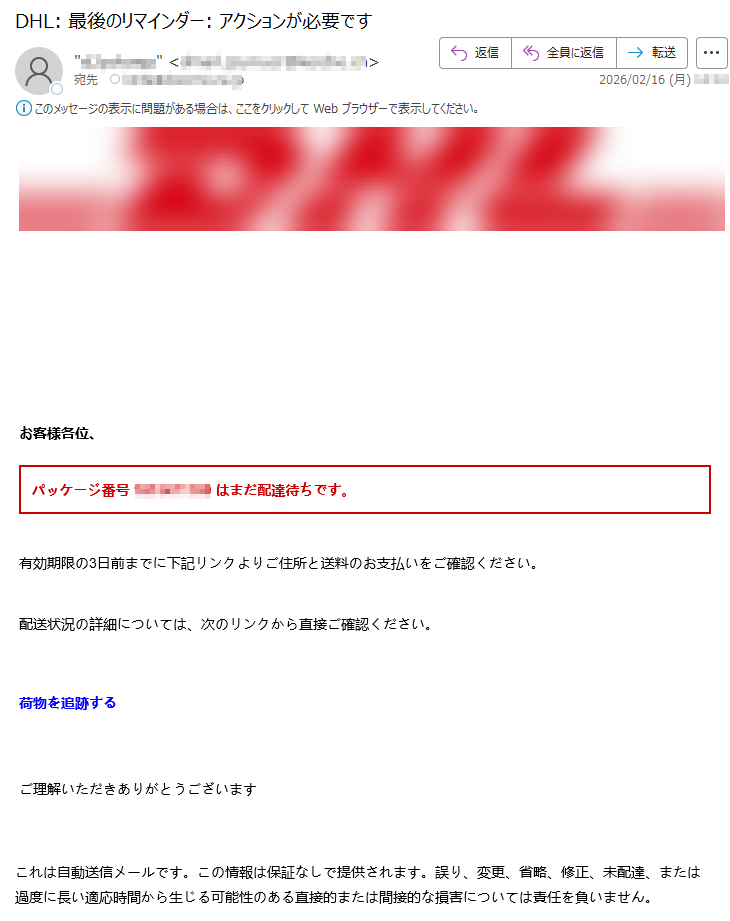 DHLになりすました偽メール「件名:DHL: 最後のリマインダー: アクションが必要です」(本偽メールは、実在の企業と無関係に送信されたものです)